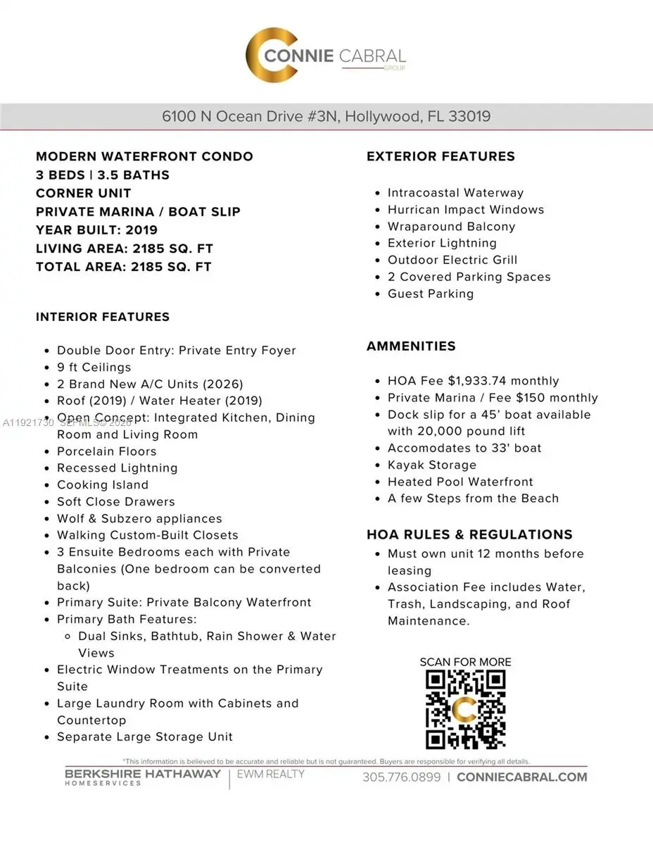 Rare opportunity ,new costruction on the beach that does not exist anywhere in Hollywood! Welcome to Seaside Village, an ultra-exclusive luxury boutique community in Hollywood Beach offering true elevated waterfront living. This modern 3BR, 3.5BA condo includes a private boat slip, accommodates a 45’ vessel, and sits directly on the Intracoastal Waterway, just steps from the beach. Enjoy private elevator entry, expansive open layout, wraparound balcony with sunset views, chef’s kitchen with Sub-Zero & Wolf appliances, full laundry room, and hurricane impact windows. Each bedroom has an en-suite bath and private balcony. Includes 2 covered parking spaces, guest parking, and a large storage unit. The gated community features a fully equipped marina with water/electric. No rental restrictions. Centrally located between Miami & Fort Lauderdale, just minutes to FTL Airport.