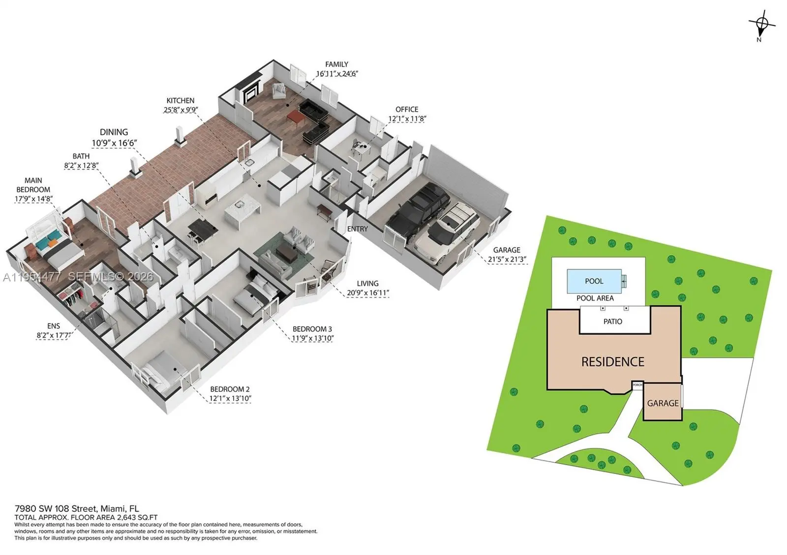 Nestled within the tranquil surroundings of Killian Green Estates, this beautifully updated 4-bedroom, 3-bath home offers a perfect blend of comfort and style. Set on a lush 0.36-acre lot accented by stately royal palms, the property welcomes you with a warm, serene atmosphere. Inside, enjoy a chef-inspired quartzite kitchen, generous living spaces, and a relaxing primary suite featuring a walk-in closet plus two additional closets for ample storage. The backyard is a true private retreat, highlighted by a sparkling pool and a spacious covered terrace ideal for both entertaining and quiet moments of relaxation. The air-conditioned garage has been thoughtfully converted into a flexible space that can serve as an office, storage area, or multipurpose room. With no HOA and no city taxes, this home delivers timeless South Florida charm in a prime and convenient location.