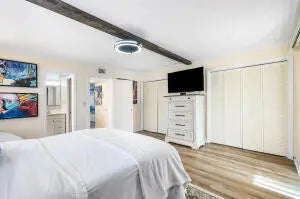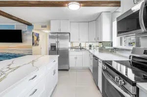 55+ Light and bright 1st floor: NO STAIRS! Park right next to your front door! Available Turnkey. Open concept Living area, huge bedroom w/spacious closets, crown molding, new kitchen & appliances, quartz counters & table-top, big island-extra storage. Year-round comfy enclosed patio. NEW ROOF-2024. NEW TANKLESS WATER HEATER-2024 NEW-A/C-2020. ACCORDIAN HURRICANE SHUTTERS on all windows. Big utility/storage room. Laundry and mailbox just steps away. WALK across the street to HEATED POOL, John Prince Park & Lake Osborne w/walking-biking trails, boating! CLUBHOUSE with activities to suit your lifestyle. Shuffleboard, Billiards & Social Gatherings. 2.9mi to beach, 8.2mi to PBI Airport, 1.3mi to I-95.