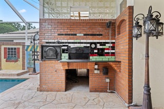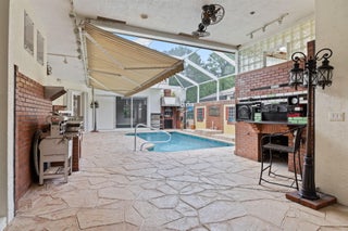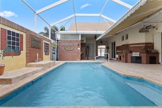Incredible 4BR 3BA courtyard pool home and detached 4th bedroom-- in-laws, guesthouse or private office. Added privacy with family, living, dining areas and breakfast nook. Step into your own quaint pizzeria! This stunning lanai, complete with commercial pizza ovens, grill, fryer and prep stations--all included. Screened pool with privacy wall, retractable awning, and vintage lighting set the scene. Inside: open, split floor plan, vaulted ceilings, tile throughout living areas, and sliders from cottage, master and living room to pool. Gas: whole home generator, dryer, stove, and instant hot water. For added strength and security the home is CBS construction with accordion shutters. Lake Charles offers clubhouse, tennis, and more--minutes from dining, golf, and I-95. Homes like this are rare