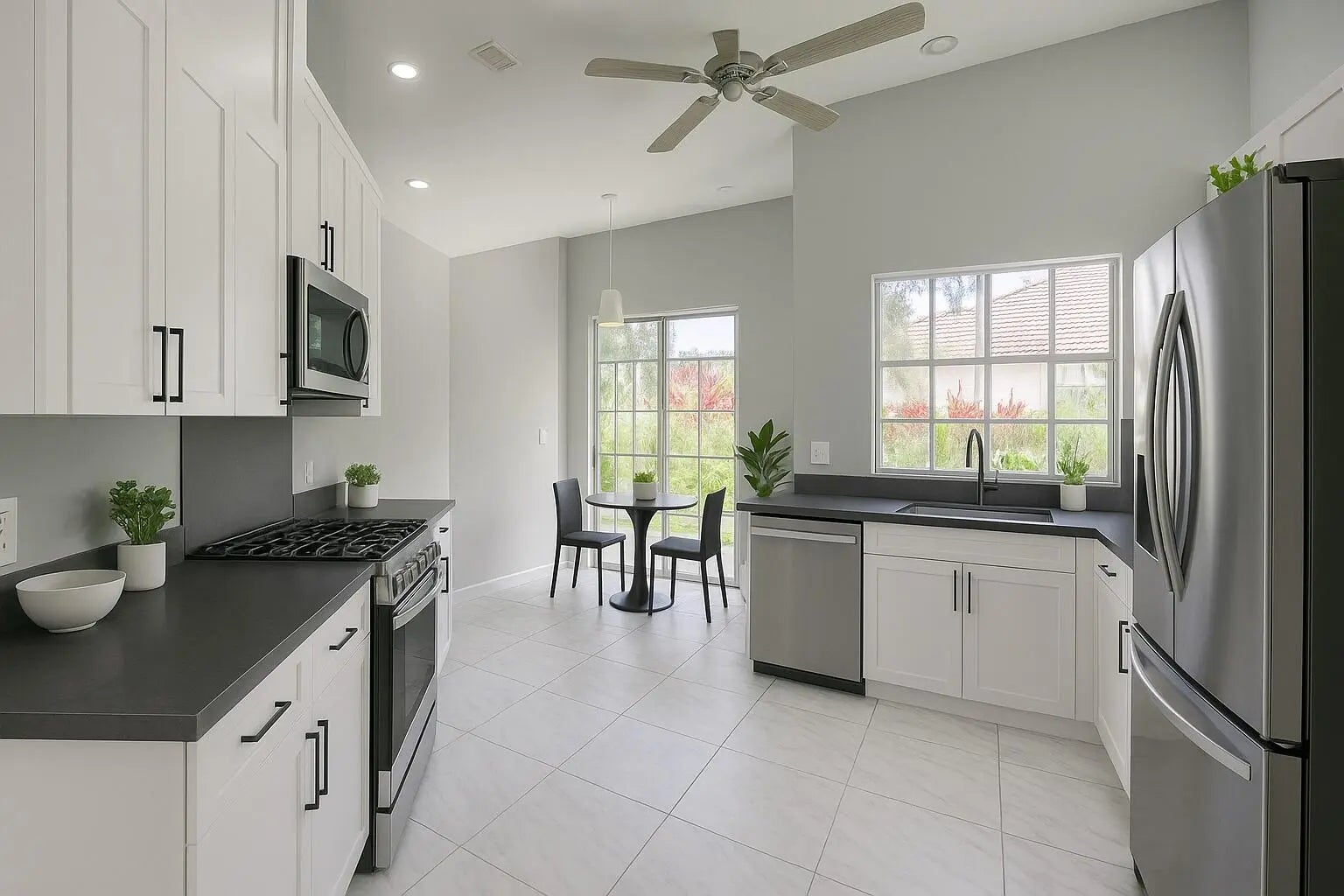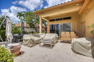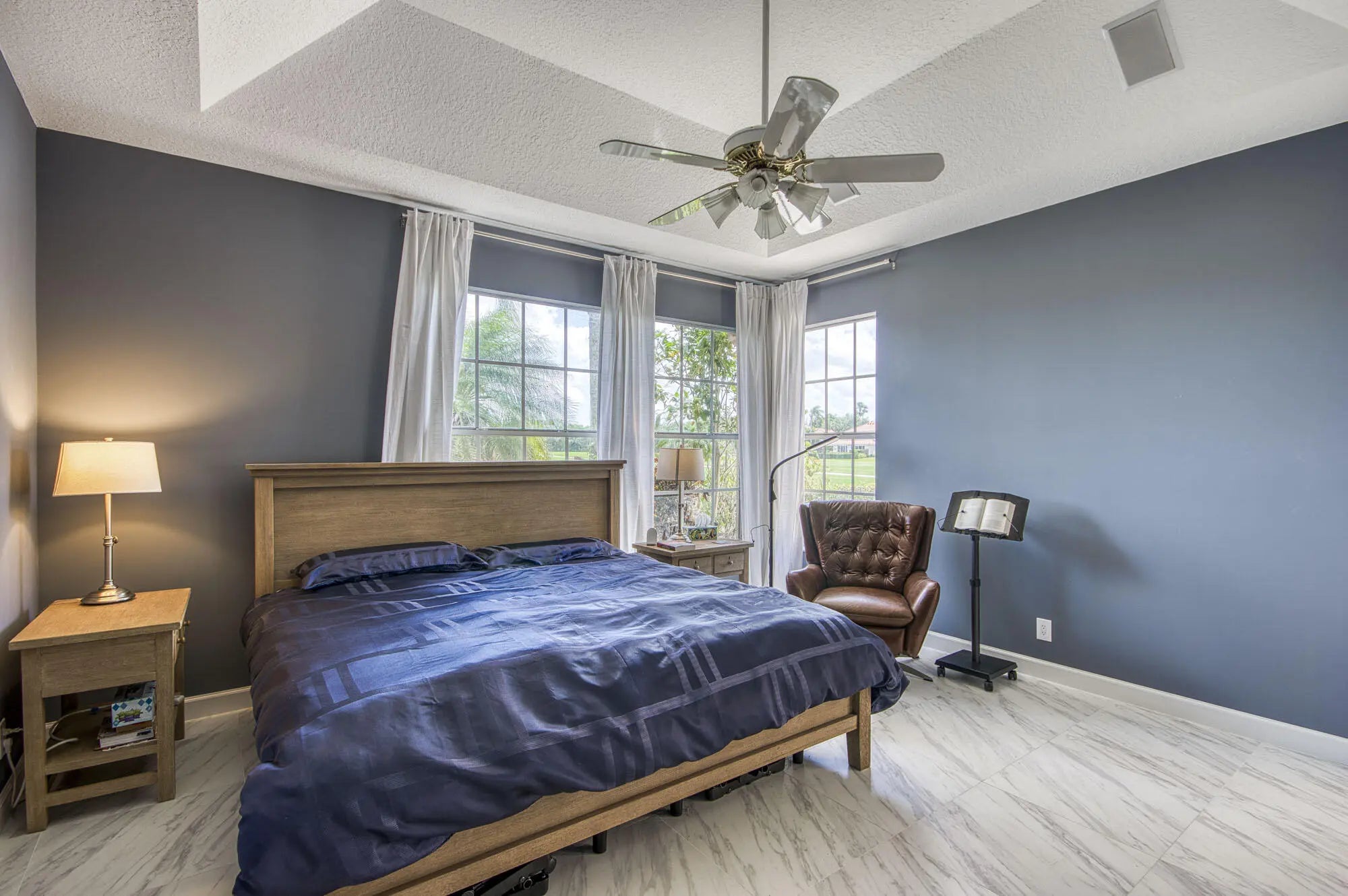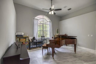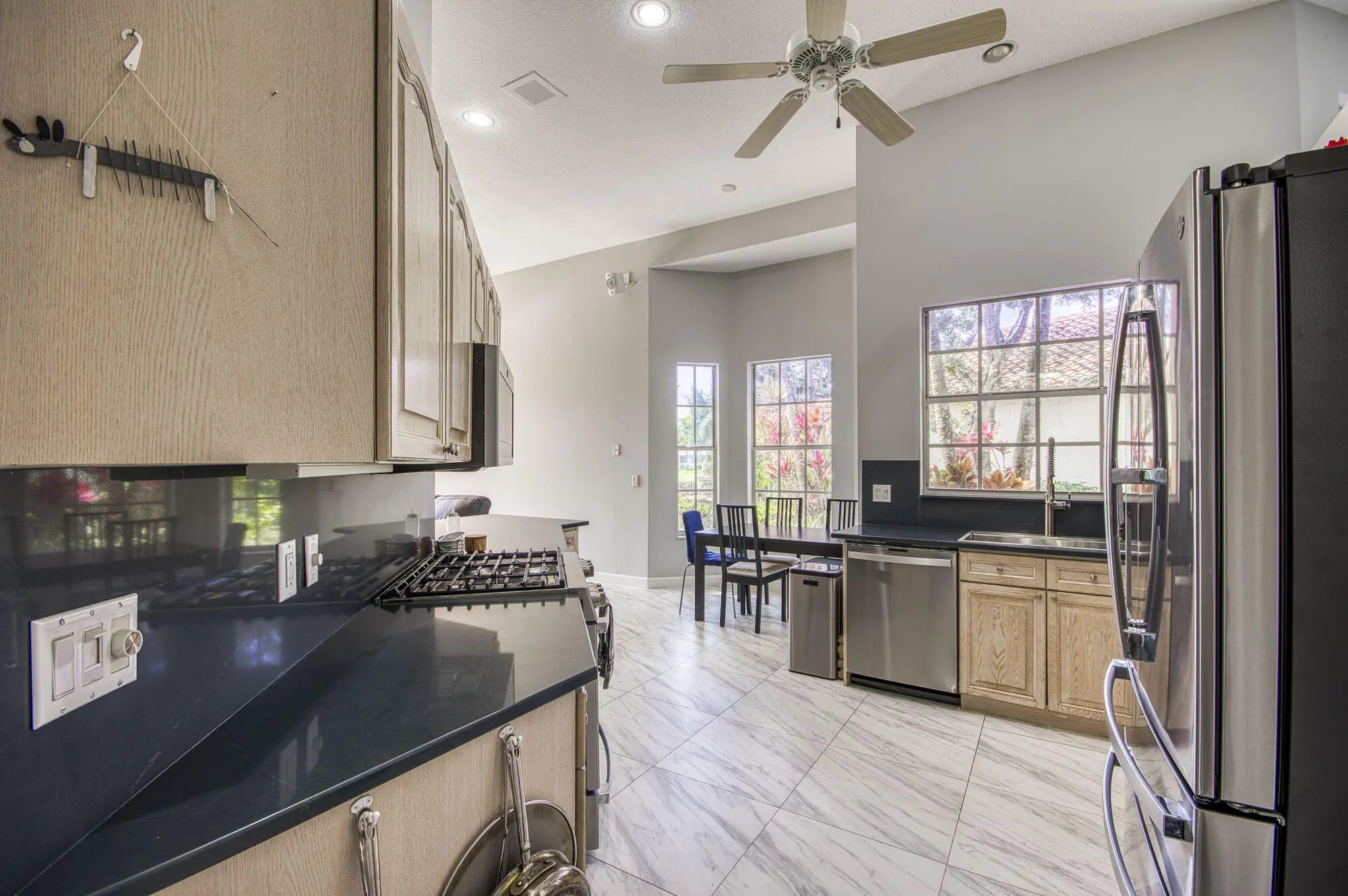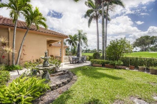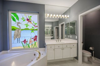 Located on a quiet cul-de-sac, this beautifully maintained home offers stunning golf course views and lush tropical landscaping. The spacious, open layout features vaulted ceilings and new porcelain tile floors throughout, with a bright and airy kitchen that includes 2022 stainless steel appliances, new black quartz countertops, and plenty of cabinet space. The family room opens to a large patio, perfect for entertaining or relaxing while enjoying view of the newly redesigned Heritage course, #1 & #9 fairways. The master suite features tray ceilings, large windows with natural light, and a walk-in closet, while the master bath includes a newly updated, walk-in shower, soaking tub, dual vanities, and a unique stained-glass window of an Ibis. The backyard is fully landscaped with