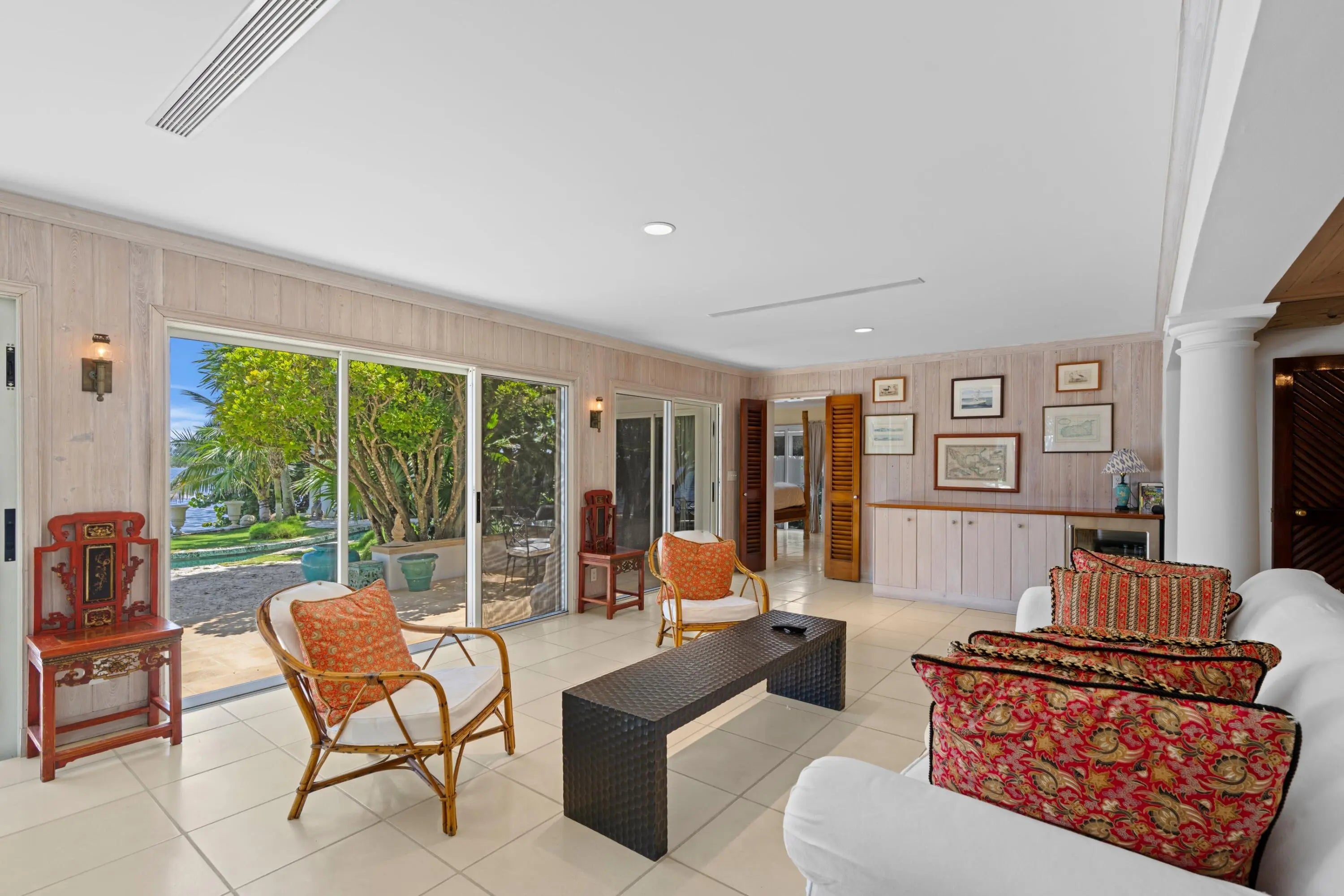Available March 1, 2026 - Located directly on the intracoastal, this single-story home is a perfect seasonal rental for someone searching for a tropical island feel, expansive water views yet quick access to Palm Beach Island. The home has an open floor plan, light filled rooms, high ceilings and abundant windows and glass doors. The home also offers Asian influences with building details and decor. Features include: a large gourmet kitchen (fully stocked), a greenhouse & herb garden, charming outdoor shower, orchid garden, full landscape lighting, a large two-car garage with extra storage, a built in grill, security lighting & gates and a 1,000 sq. ft. private dock area looking out at ''Billionaires Row'' estates on Palm Beach.