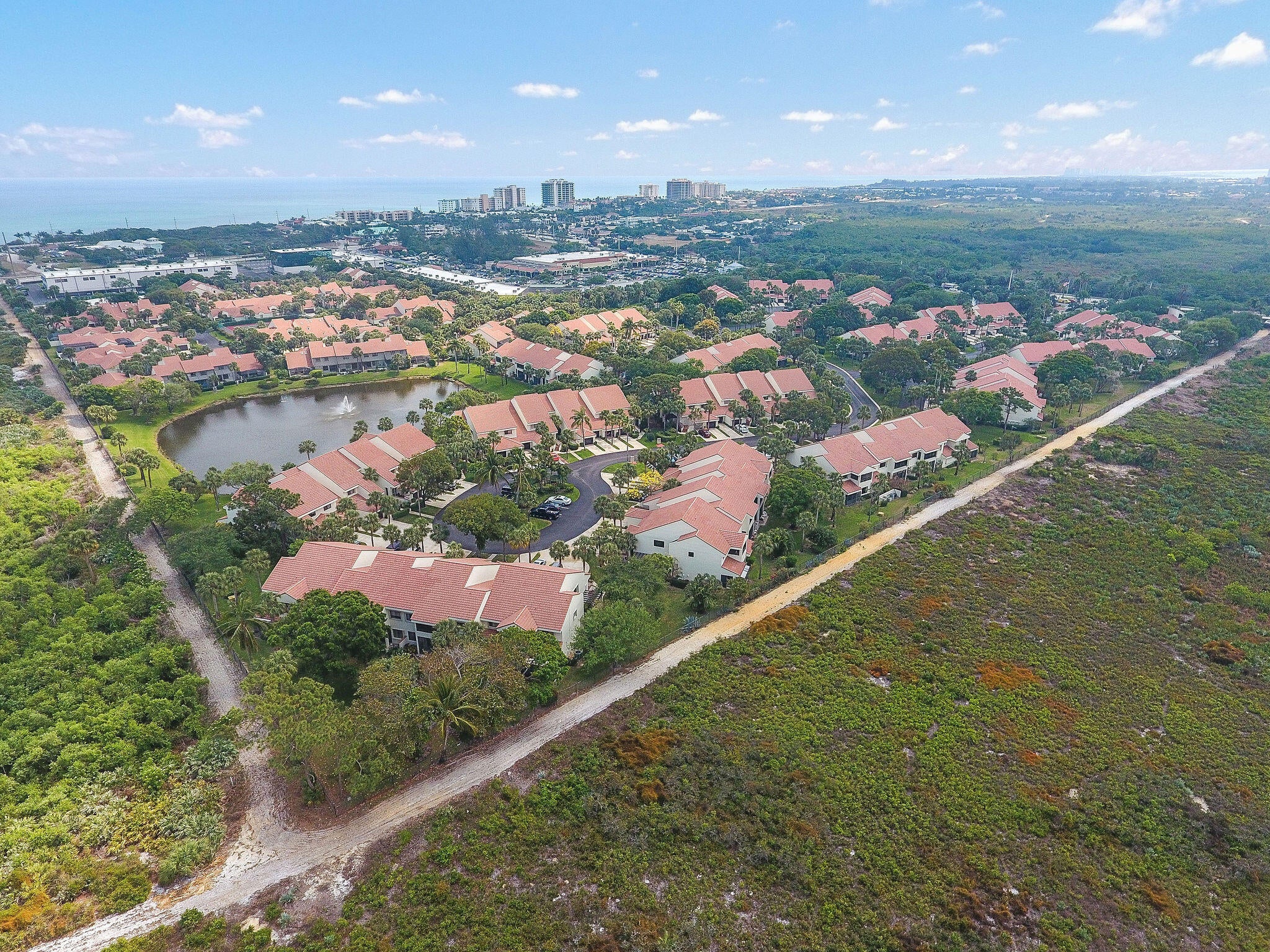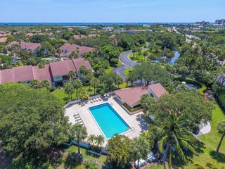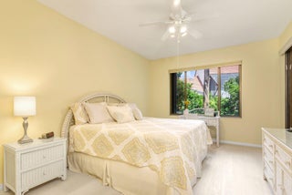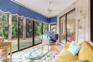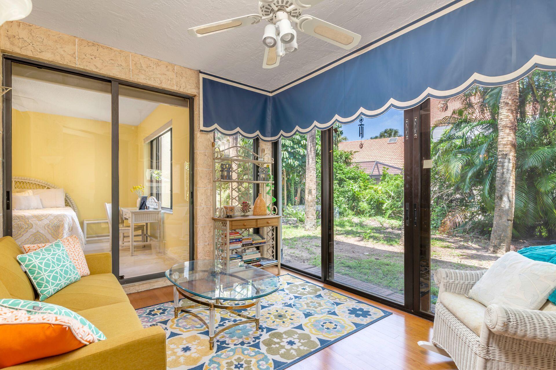 This first-floor condo offers step-free access and no carpeting, featuring vinyl plank flooring and tile throughout. The condo has a wonderful tropical feel, from the front entrance to the lush greenery visible from the moment you walk in. The spacious primary suite is furnished with a king-size bed. The second bedroom includes built-ins, a fold-down desk, a full-size Murphy bed, and two comfortable chairs. An enclosed porch provides additional space for relaxation. The community features a newly renovated pool, lounging area & tennis courts. The location is ideal, just a short walk to beautiful beaches & close to excellent shopping, amazing restaurants, golf courses, and Abacoa, the spring training home for the Cardinals and Marlins. PBI less than 30 min drive!