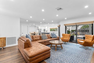 BOATER'S DREAM! Deep water (dredged to 5'-6' MLW), NO FIXED BRIDGES, NO HOA, NEW 35,000-lb LIFT (2024), & NEW ROOF (2024). Fully RENOVATED inside & out, this waterfront gem offers a private, full-service 80' dock w/ electric/water, open floor plan, & low-maintenance living. Enjoy the oversized lanai & refinished pool while taking in views of your boat just steps away! Inside, find full impact doors/windows, sustainable laminate flooring, & a Chef's kitchen w/ an oversized island, custom cabinetry, Bosch cooktop with flush-mount linear hood, double ovens, wine cooler & under-counter microwave. Sleek renovated baths feature marble shower floors, linear drains, rain showers, & ambient lighting with anti-fog, dimmable mirrors. Custom closets, abundant storage.... (see more) and a decorative circular drive with ample parking completes this gorgeous home. BEST VALUE for deep dockage with all the bells & whistles!