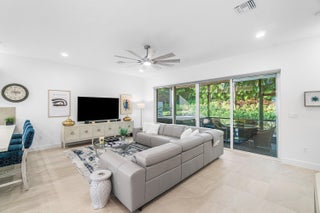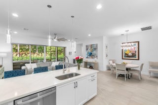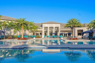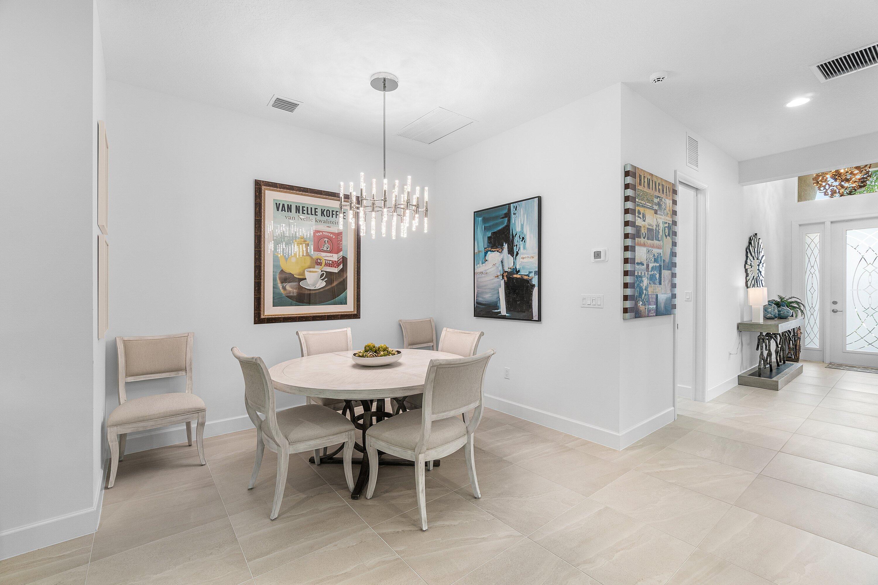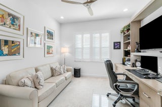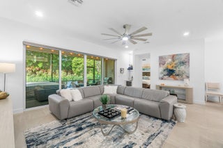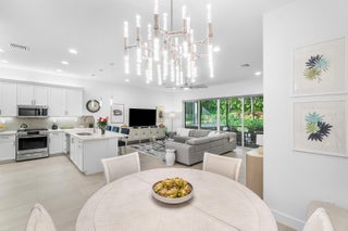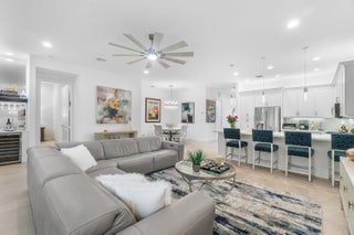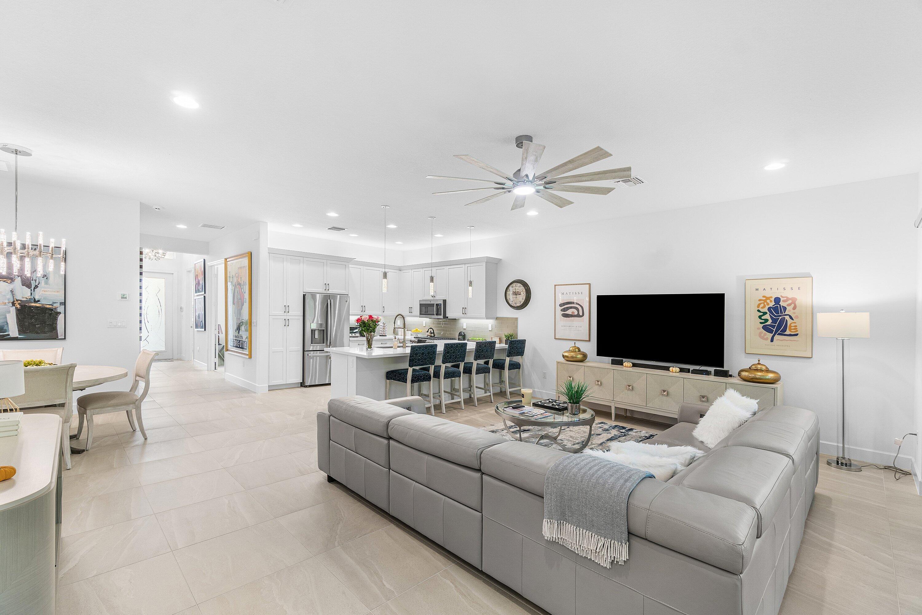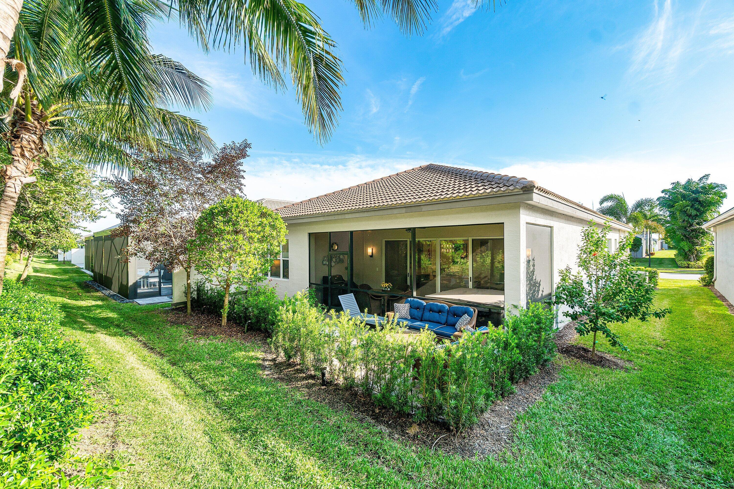 Experience the perfect blend of elegance, functionality, and modern luxury in this stunning Sapphire 2 bedroom PLUS Den model w/over $100,000 in UPGRADES, located in the highly sought-after Valencia Sound community. Every detail has been thoughtfully curated to create a home that is as beautiful as it is comfortable. This is the ONLY Sapphire model on the market at the moment! Step through the etched glass entry door with sidelight into a bright, open concept floor plan featuring stunning porcelain tile throughout living areas, high-end lighting fixtures & ceiling fans, and extra hi-hat lights, highlighting the meticulous attention to detail. The gourmet kitchen is a true culinary centerpiece, showcasing an expansive and gorgeous Quartz island, large single sink, white cabinetry, pristine Quartz countertops, grey glass subway tile, backsplash, trash pull out, pantry, and top of the line stainless steel GE appliances including a natural GAS range! The spacious dining room is open to the kitchen and great room, which is open and airy and lined with impact resistant sliding doors offering tranquil and tropical garden views, and a built in wine bar with lighting! The primary suite is spacious, with plush carpet, motorized blinds and custom drapes, dual walk in closets with custom built-ins including a glass door cabinet and lots of drawers, as well as lovely garden views. The master bath offers a spa-like atomosphere with large glass door shower, dual Quartz vanities, and generous linen closet. Bedroom 2 is ample in size and has an en-suite bath with custom framed mirrors to the ceiling, glass door shower with tiled extended to the ceiling, Quartz vanity, and porcelain tile. The den features a custom made built-in with remote controlled lighting which provides an ideal space for a home office or study, or to use as a 3rd bedroom (no closet) by utilizing a sleeper sofa, and space for a large wall mounted flat screen tv. Designed for comfort and convenience, this home includes impact-resistant glass throughout, natural gas appliances, motorized blinds, professionally epoxyed garage floors, a built in work station and cabinets, steel pull down attic stairs to access ample storage space in the attic, and an extended back paver lanai that seamlessly connects indoor and outdoor living. Lush tropical landscaping completes the picture, providing a serene and inviting setting. This residence combines thoughtful upgrades, sophisticated finishes, and a prime location in Valencia Sound, a [premier active community with an abundance of social opportunities and amenities, including an expansive clubhouse, full service restaurant serving breakfast, lunch and dinner 6 days a week AND sports lounge, resort style pools, state of the art fitness center, aerobics room, bocce ball, billiards, card rooms, theater and social hall, tennis, pickleball, arts and crafts studio, and countless clubs and organizations all awaiting you! This home offers the ultimate in Florida luxury living! *(Hot tub, dining room chandelier and entry chandelier do not convey.)*