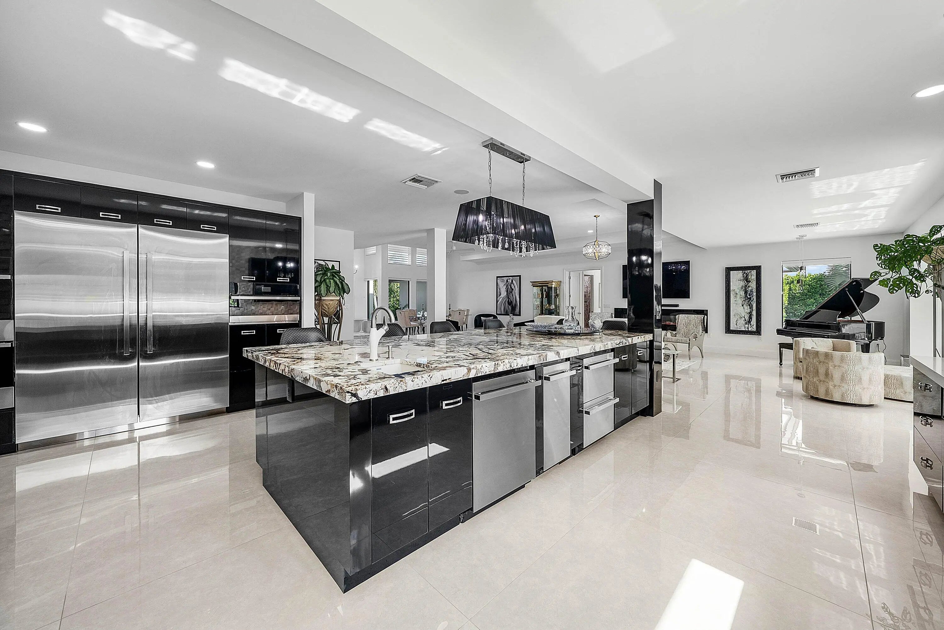 Welcome to an exceptional totally renovated 2021 Estate offering a refined living space in the prestigious Delray Dunes Golf & Country Club. Perfectly positioned on a .45-acre lot with southern exposure, this home enjoys commanding views of the 14th & 15th fairways. A circular driveway and porte cochere lead to a new glass entry door and a bright, open interior featuring soaring ceilings, a private elevator, and 48x48 porcelain tile throughout. The Chef's kitchen is built for grand entertaining with top-of-the-line appliances, oversized island, double dishwashers, new double ovens, commercial-grade refrigeration, and more. The great room, with electric fireplace and expansive sliders, flows seamlessly to the outdoor living spaces overlooking the course. A stunning glass-enclosed wine room