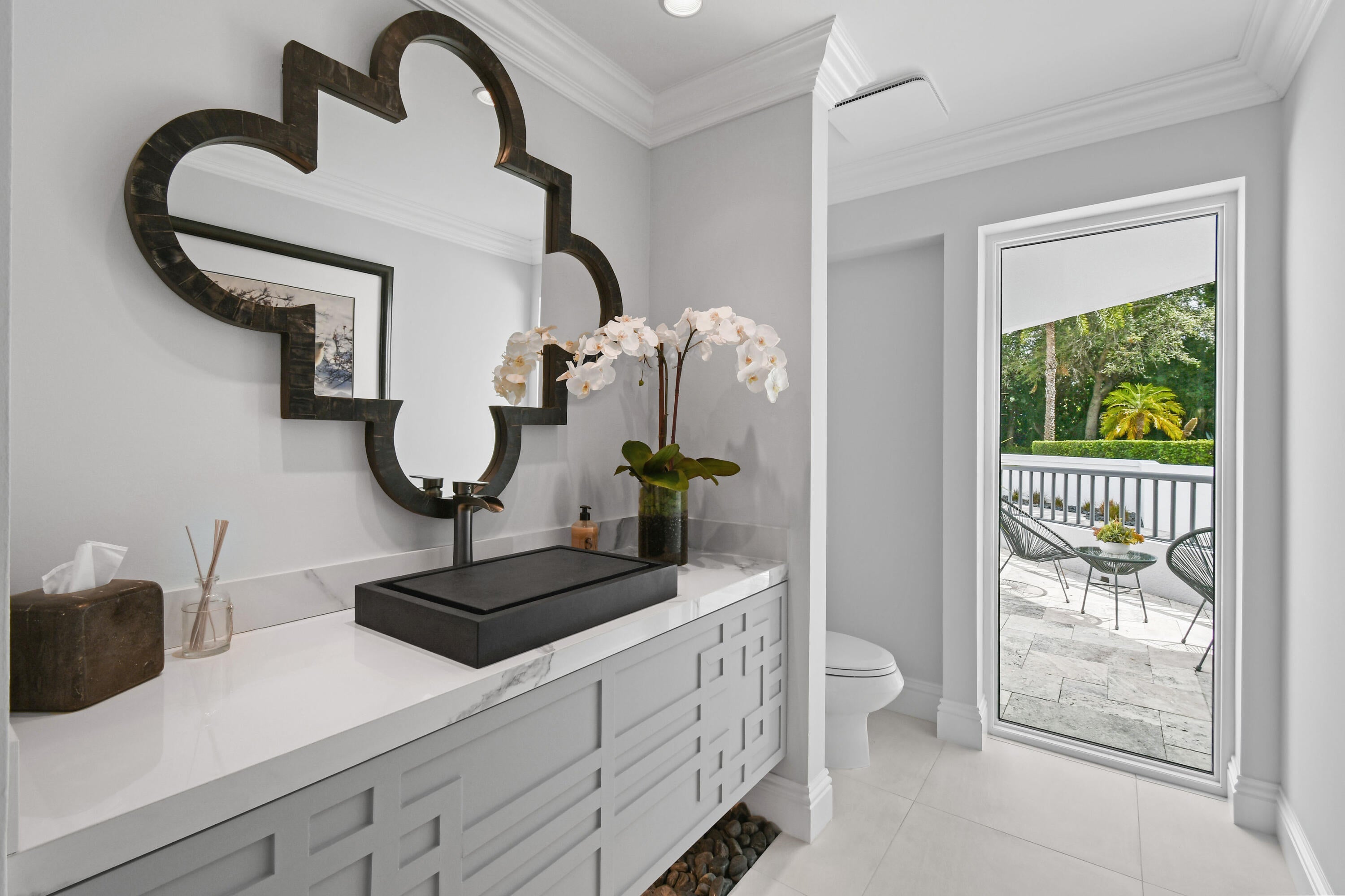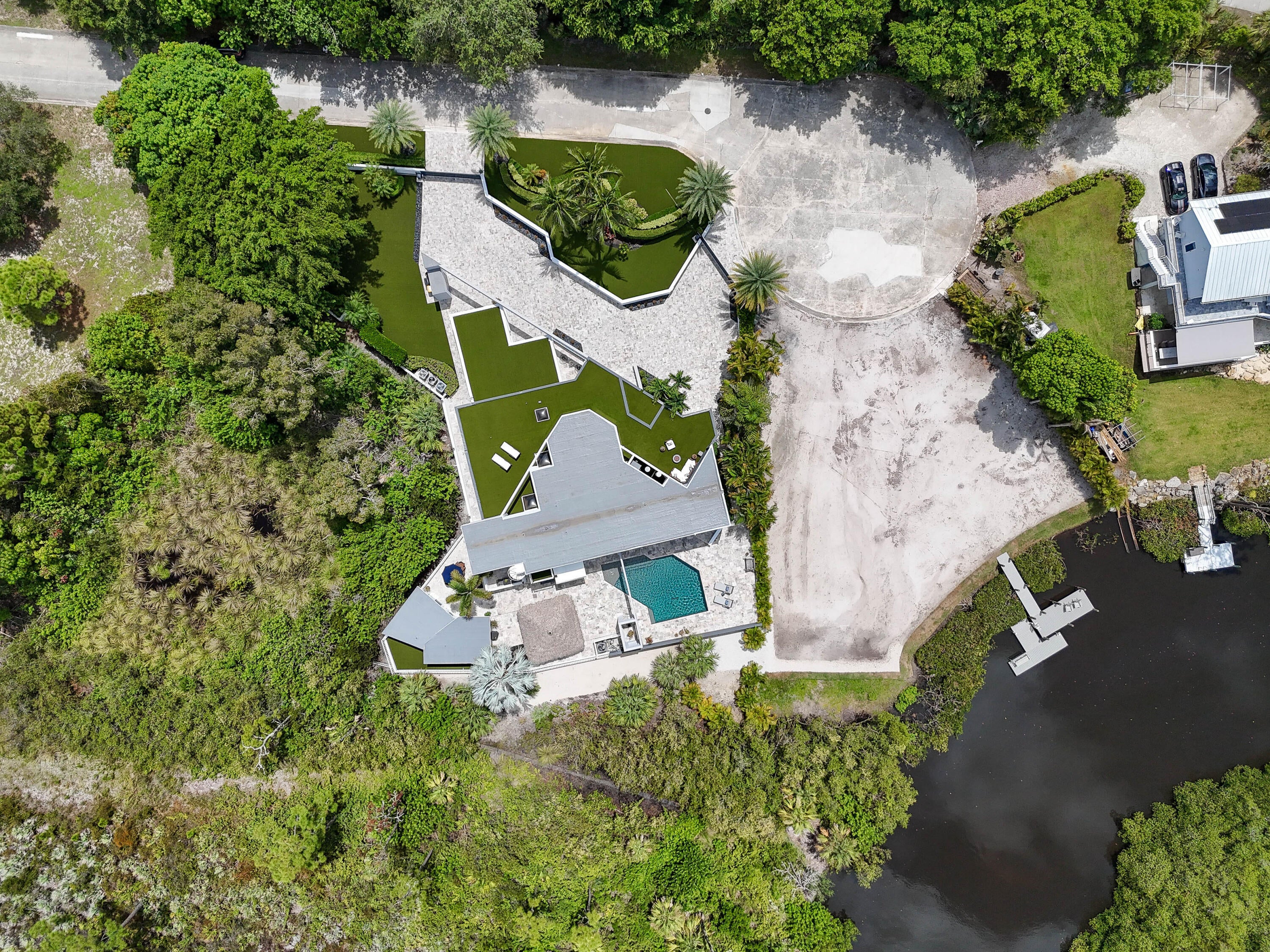 Stunning, Fully Furnished Home. Newly Renovated CBS Modern Home with Detached Guest House and River Access for water recreation. High and dry property surrounded by concrete walls. Large Captivating Pool, Cedar Built-In Sauna, Turf Rooftop Decks and Lawn, Expansive Silver Travertine Driveway & Pool Deck, Hardscaping with Private Gated Entry. Epic Views of Loxahatchee River & Jonathon Dickinson State Park with sunset views. Minutes to the Beach. 5 Bedrooms, 4.5 Bathrooms offering nearly 5000 sq ft of Airy Living Space and Abundant Natural Light. Large Private Property with 18 sq. miles of Park Land for Hiking/Biking Trails from your back door access. Awe-Inspiring Second Level Master Bedroom Suite with office/exercise room and outside shaded deck offering breathtaking 180 degree viewsof the River and Park. Access to the outside from every room in the house via patio, balcony, deck, and rooftop. New recent upgrades include: New Roof, Entrance & Exit aluminum powder coated modern Driveway Gates, Silver Travertine Driveway, Porcelain Floors in kitchen, family room, dining room, bathroom, laundry room, and center Glass Staircase area, new Tiki Hut, exterior & interior Painting, extensive Landscaping, Hardscape work including Black Polished Japanese Stones surrounding property, and exterior stucco/wood work. Gourmet kitchen, Two dramatic and elegant working marble fireplaces, custom glass staircase railing, Impact glass windows and doors, New Oversized Impact Garage Doors, Three car garage w/ finished floor, Volume Ceilings, Large Heated Salt Water dark bottom Pool with Glass Tile and pool shelf(baby friendly), Silver travertine decking throughout the backyard, large covered front porch, stairs, paths, balconies and lanai area. Large driveway with ample parking for cars, boats, or RV. Security cameras & Alarm system. No HOA fees and low Martin County taxes. Just minutes to shopping, fine & casual dining, entertainment, and the beach. PBI is 30 minutes away.