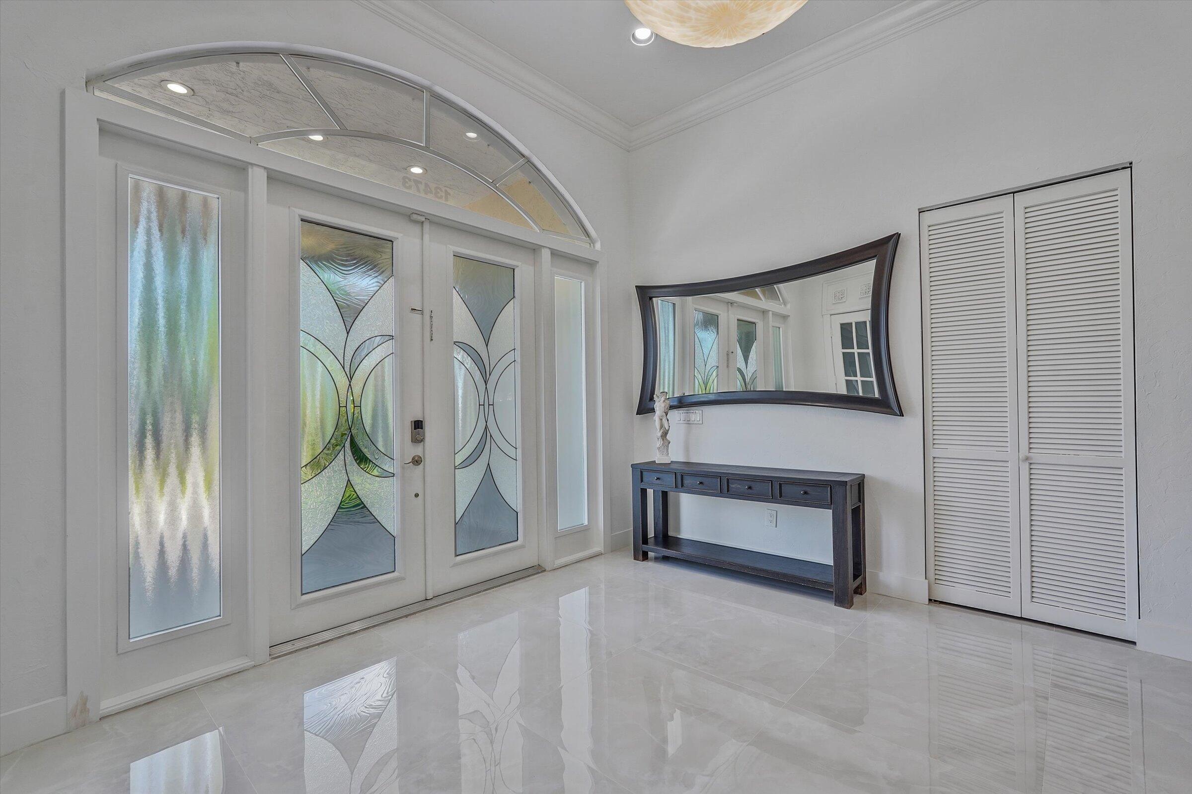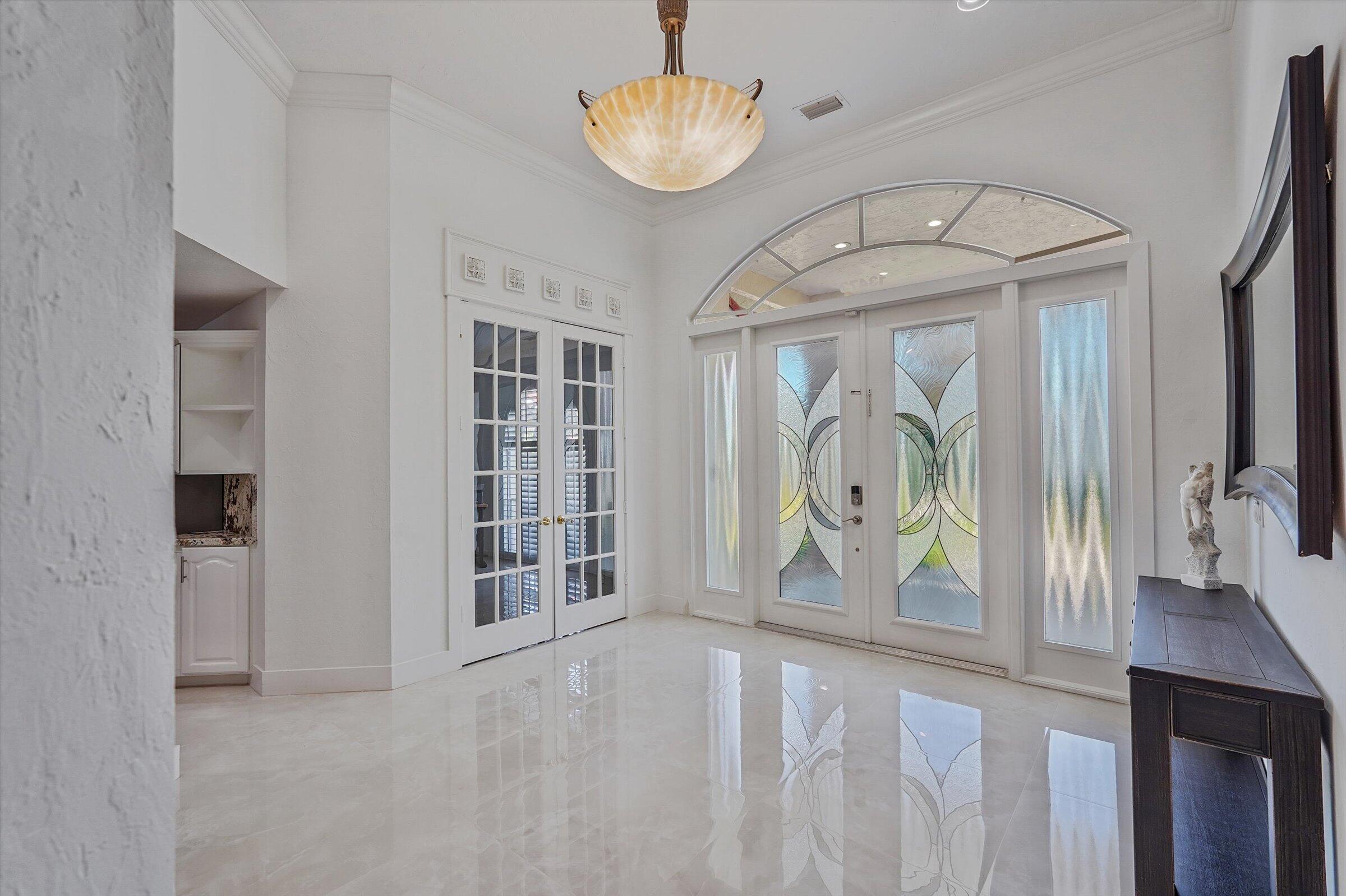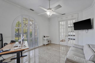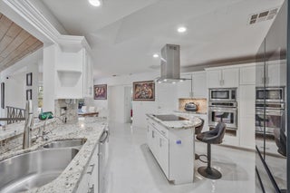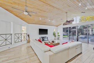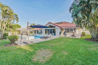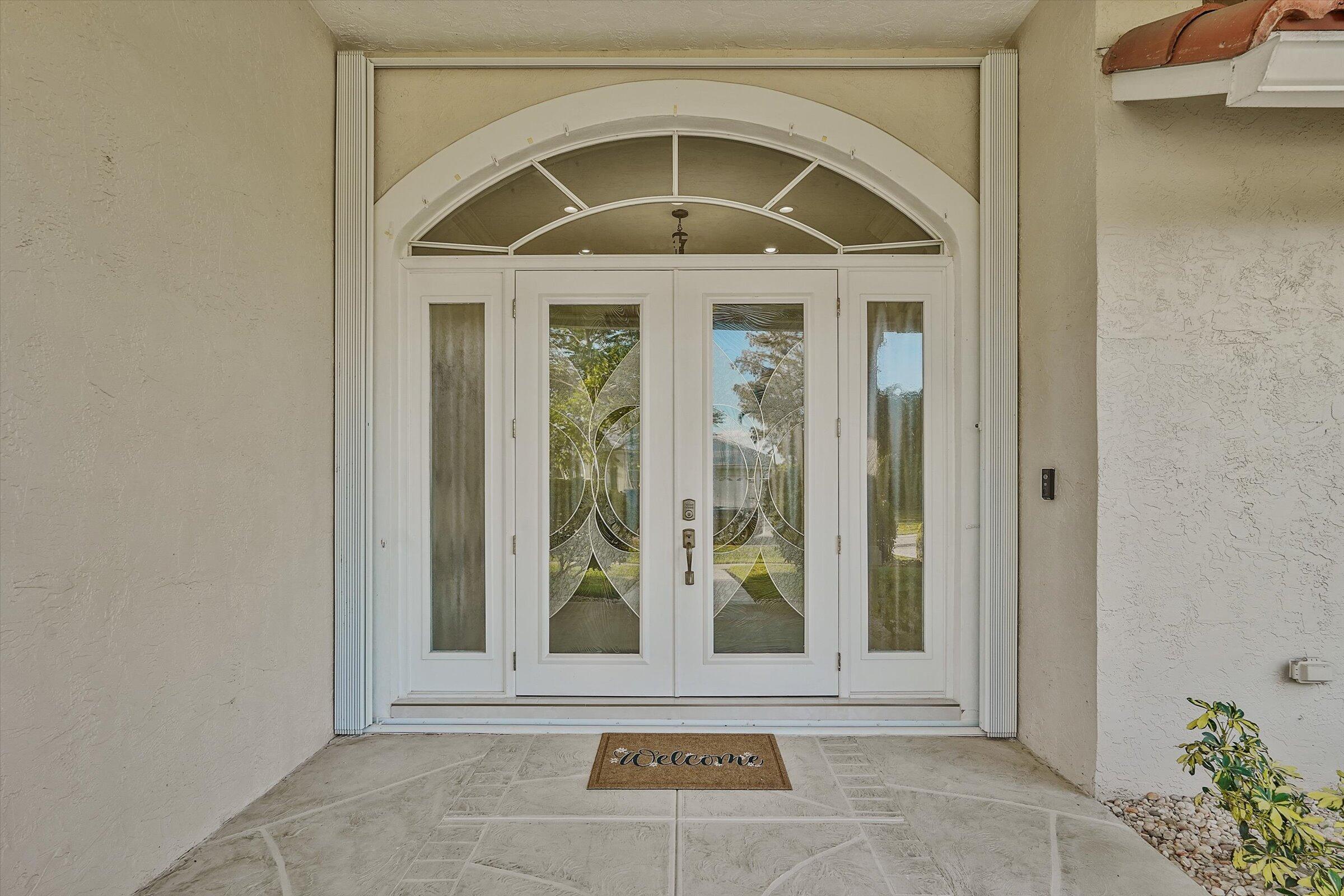 NO HOA! Beautifully upgraded custom home built for entertaining on a private 1/3-acre lot. Clay tile roof replaced in 2019, professionally inspected and maintained by ShakeMasters. Upgraded entrance doors and driveway lead to a double-door foyer opening into a spectacular 2725 great room featuring knotty pine vaulted ceilings, clerestory windows, motorized blinds, and faux wood shutters throughout the home.Pocket sliding glass doors create an impressive 16-foot opening to the custom resort-style 2040 pool, recently upgraded with new plaster, a saltwater system, and solar pool heater, all enclosed by a screened patio. Lush landscaping, fencing, and full accordion hurricane shutters provide privacy and peace of mind.The kitchen is designed for both function and style, featuring quality wood cabinetry, gorgeous granite countertops, a convertible island with mounted range hood, and updated finishes. New flooring throughout the entrance, hallways, kitchen, dining room, and laundry room (2024) complements the home's modern aesthetic, along with fresh interior paint (2024). The home offers fully updated bathrooms, including a third bathroom remodeled in 2024, upgraded guest bath, and custom closets in all bedrooms. Additional improvements include garage flooring, new HE AC units, and a new water heater. French doors off the foyer open to a 16×14 den, ideal for a home office or flex space. Located in a highly desirable community, just a short walk to a beautiful lakefront park with picnic areas, playground, swings, and lake access, and zoned for A-rated schools.