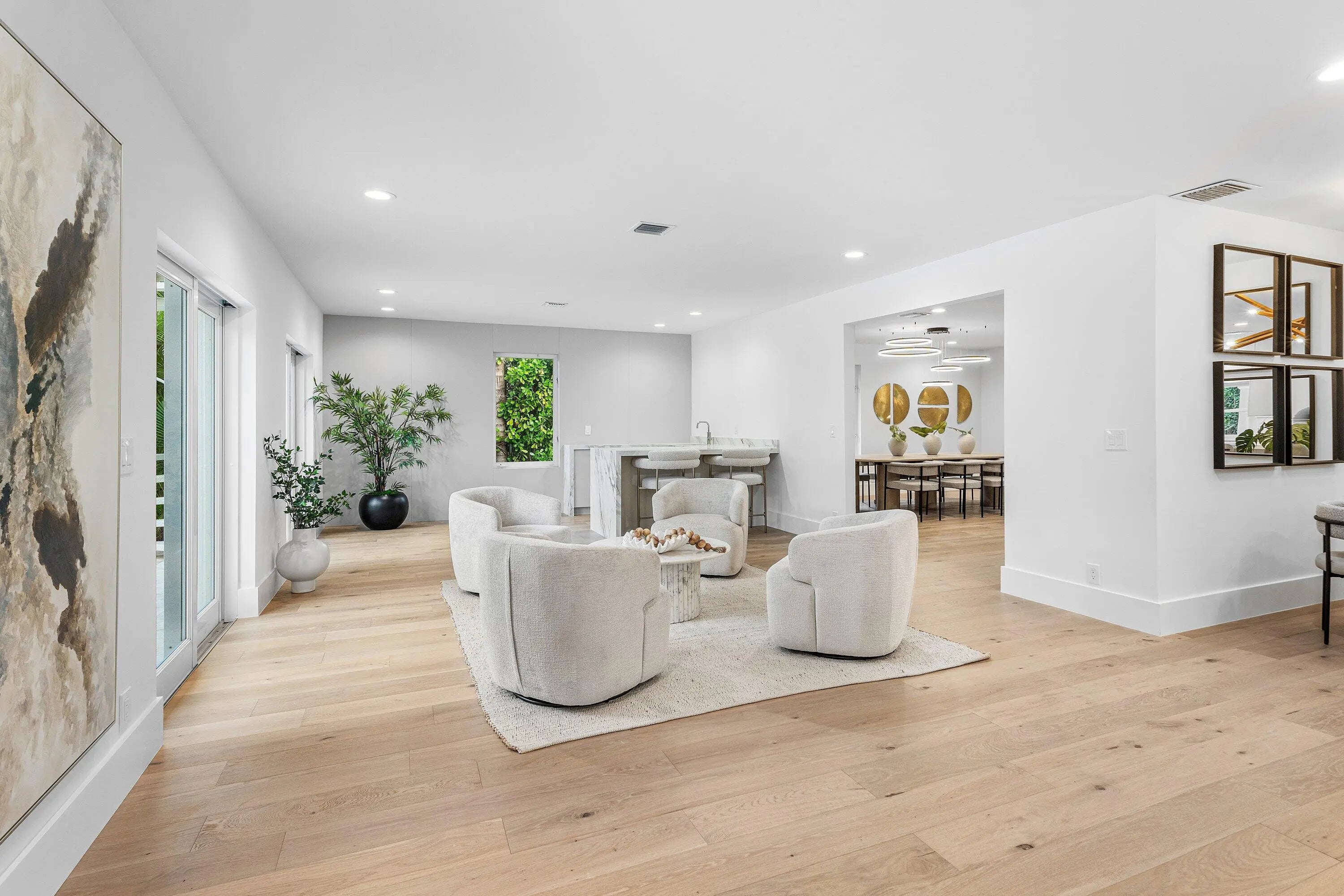 Welcome to this timeless Gulf Stream residence, perfectly situated on a large, private lot within Place Au Soleil. As you enter through the double doors, you are greeted by an inviting layout that blends classic comfort with today's clean, coastal style.The interior features 4 bedrooms, 4.5 bathrooms, plus a dedicated office, and has been completely renovated with a modern coastal vibe, highlighted by white oak flooring throughout the main living areas and a modern kitchen with a massive center island, built for everyday living and easy entertaining. The first floor offers multiple living spaces with great flow and large windows that fill the home with natural light.Additional highlights include hurricane impact windows and doors, a newer roof, a heated pool, full cabana bath...