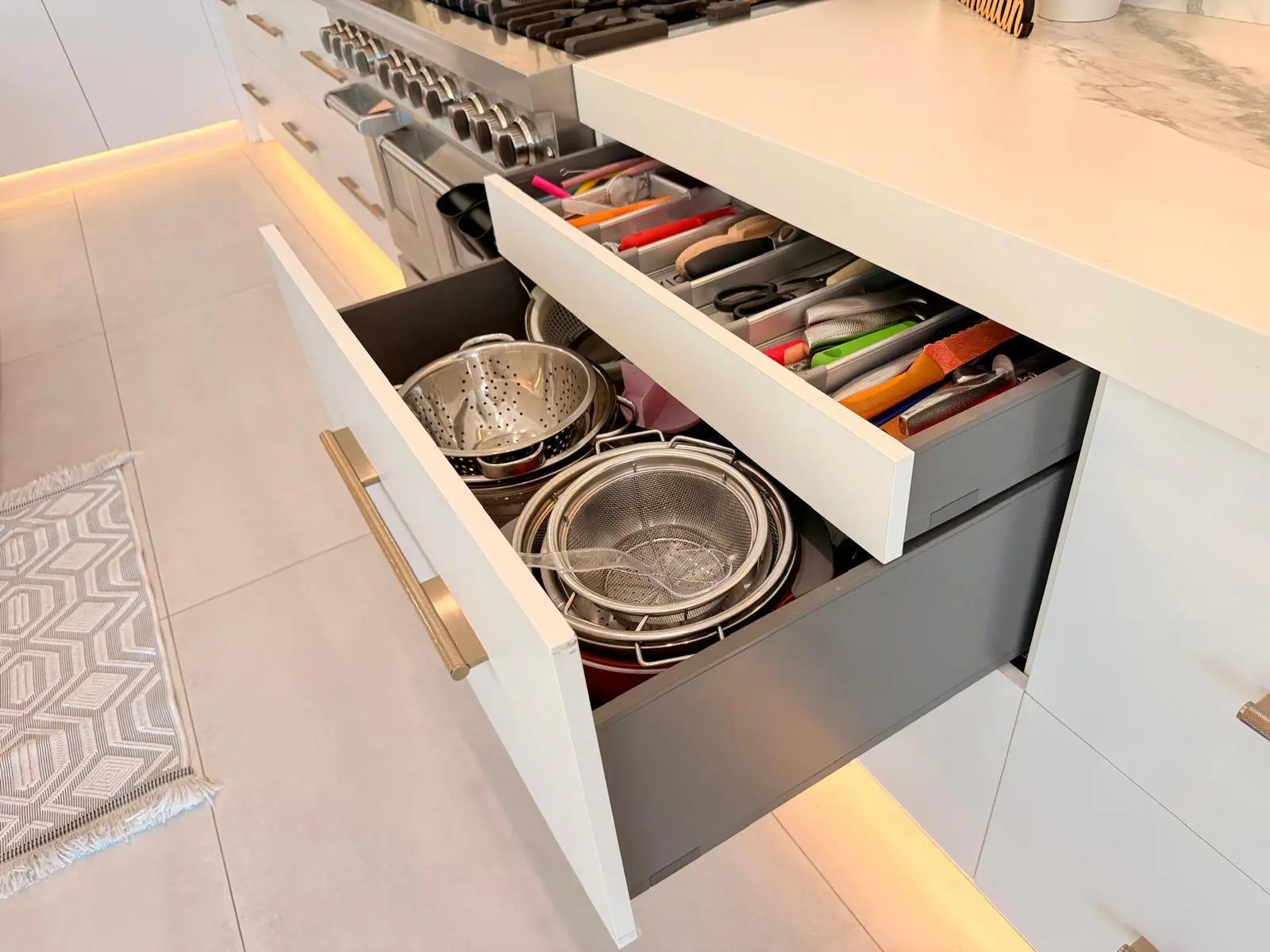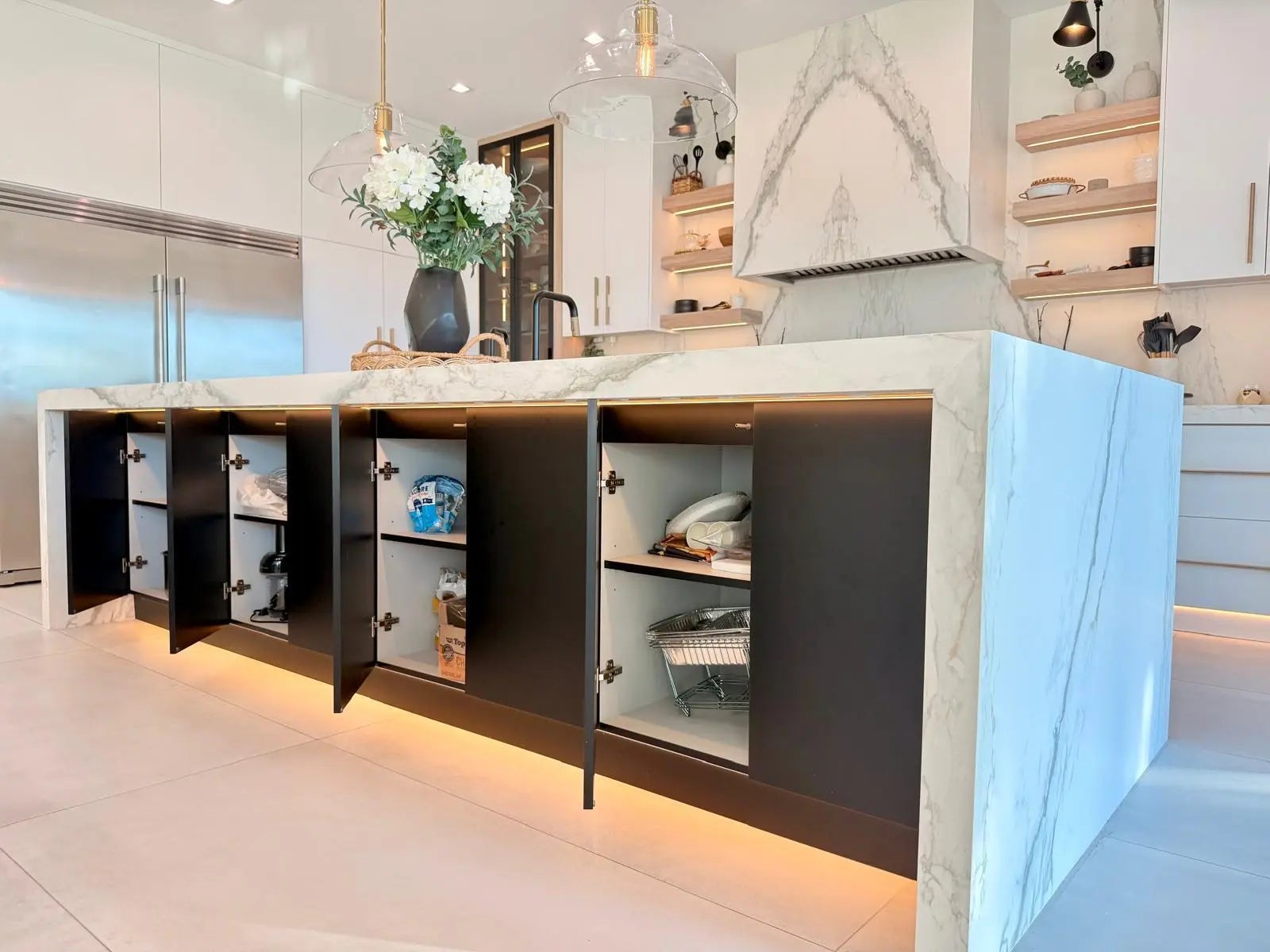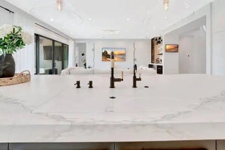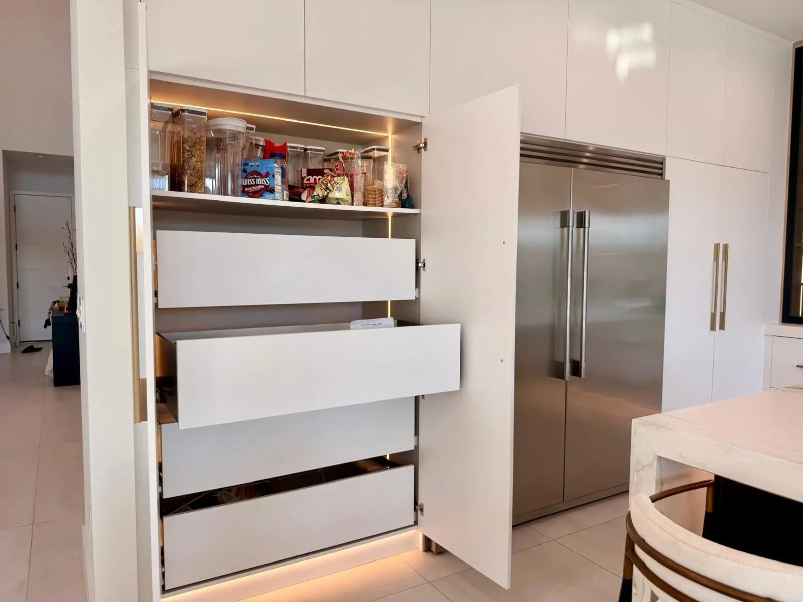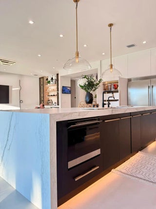 Home will be sold with a pool construction contract in place. Pool construction will begin after closing and will be paid for, with flexibility for the buyer to customize or modify the design to suit personal preferences. The home is offered fully furnished, providing a seamless, move-in-ready experience. Inside, the residence features a completely redesigned, one-of-a-kind kitchen, fully removed and rebuilt far beyond the original builder's layout. Expanded in both size and functionality, the kitchen showcases premium custom cabinetry, an oversized waterfall island, high-end porcelain surfaces, a 66'' built-in refrigerator, 48'' gas range, microwave drawer with air-fryer, paneled dishwasher, dual oversized pantries with interior lighting, and refined designer finishes. Not an average hou