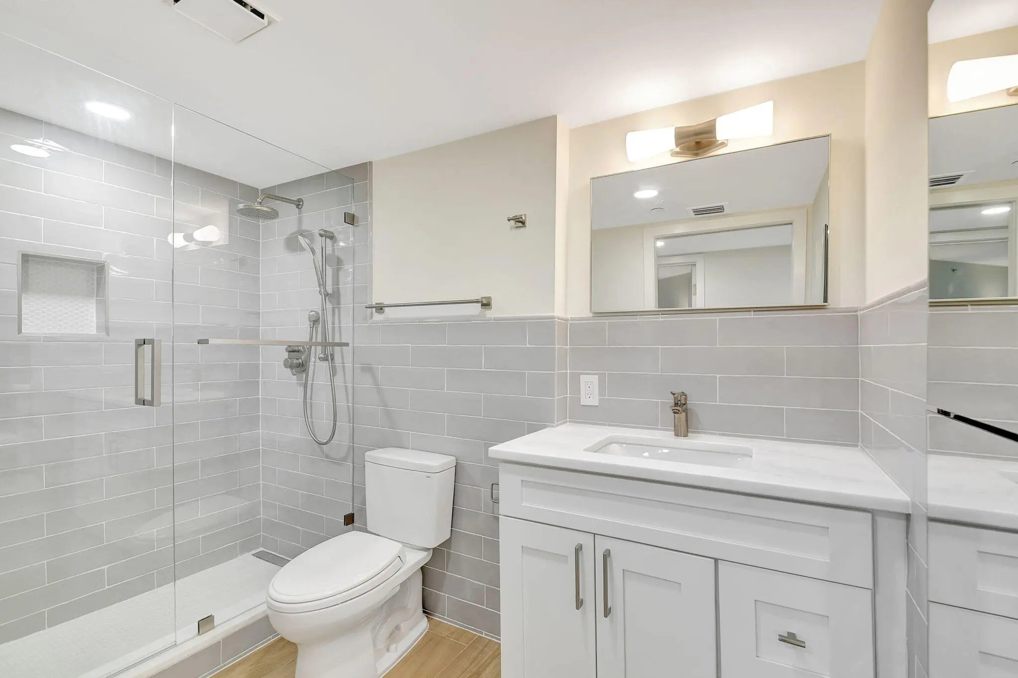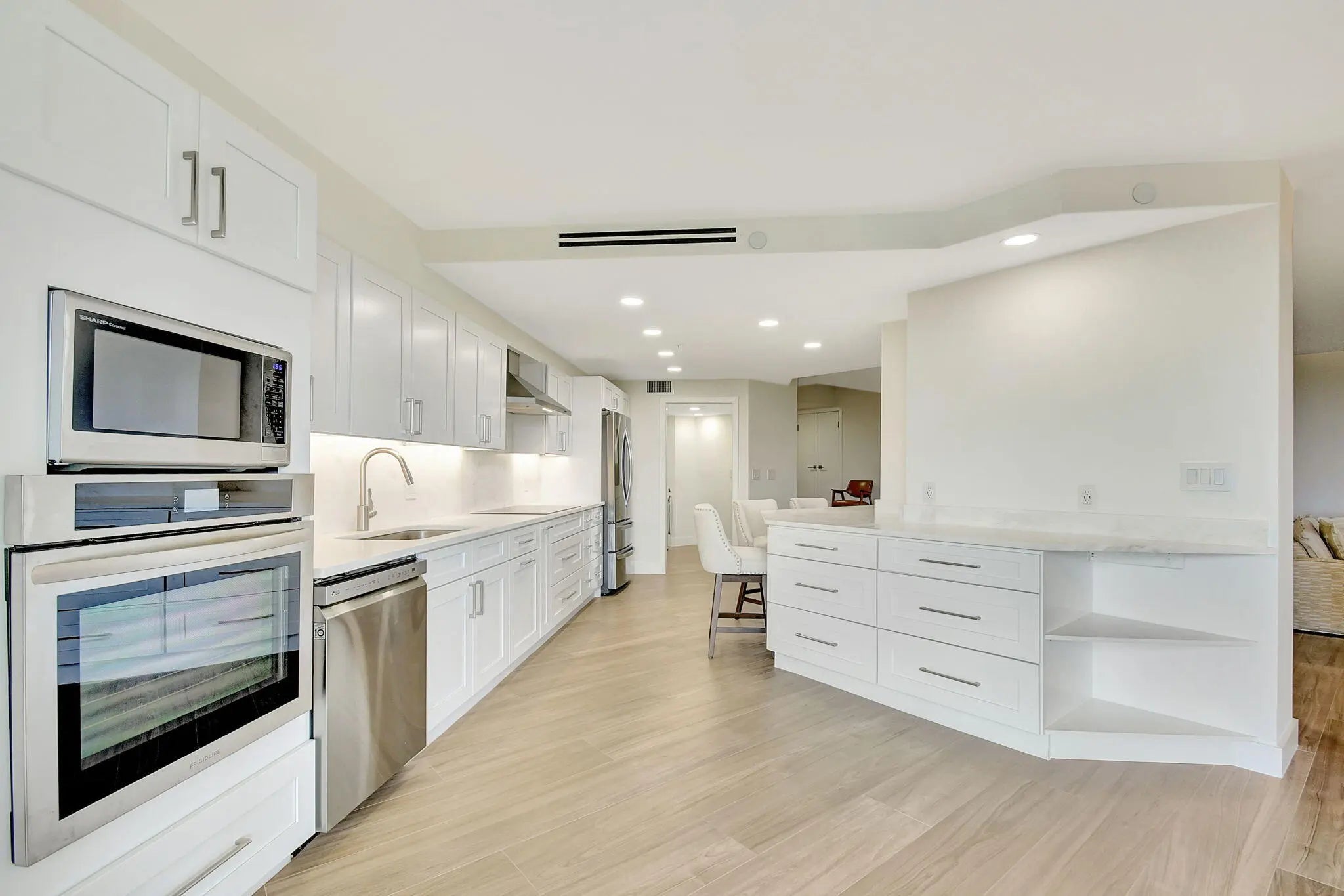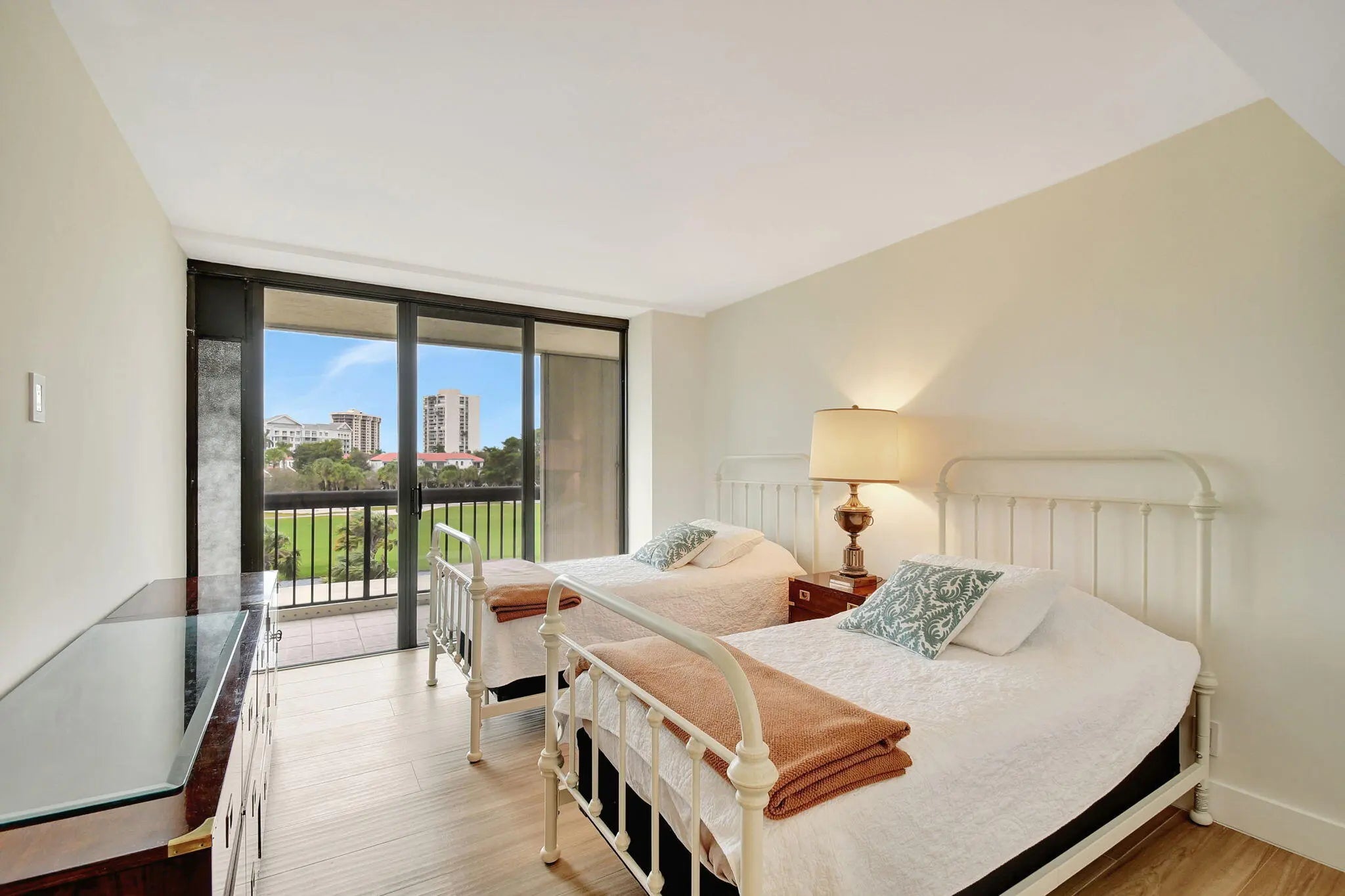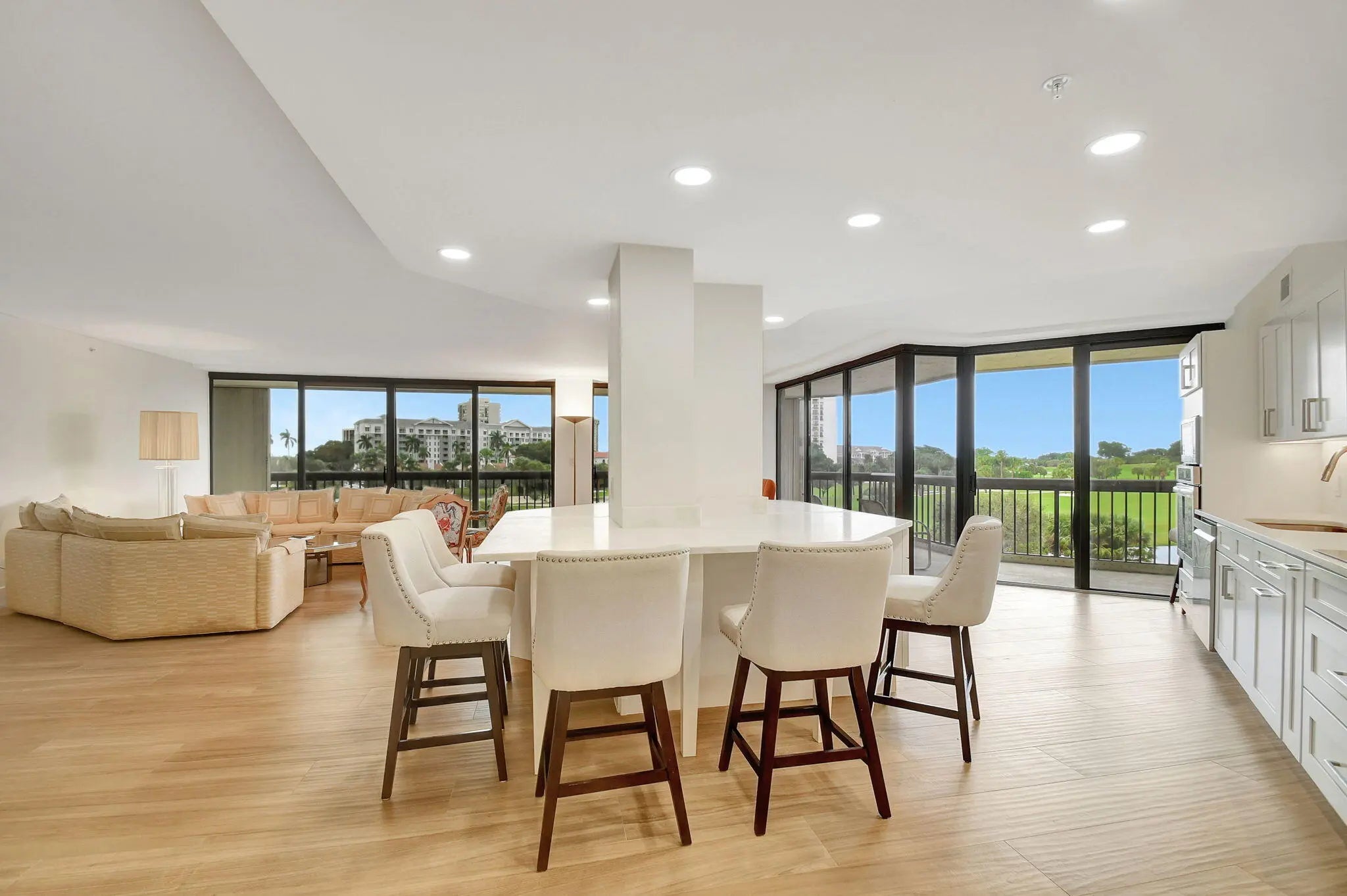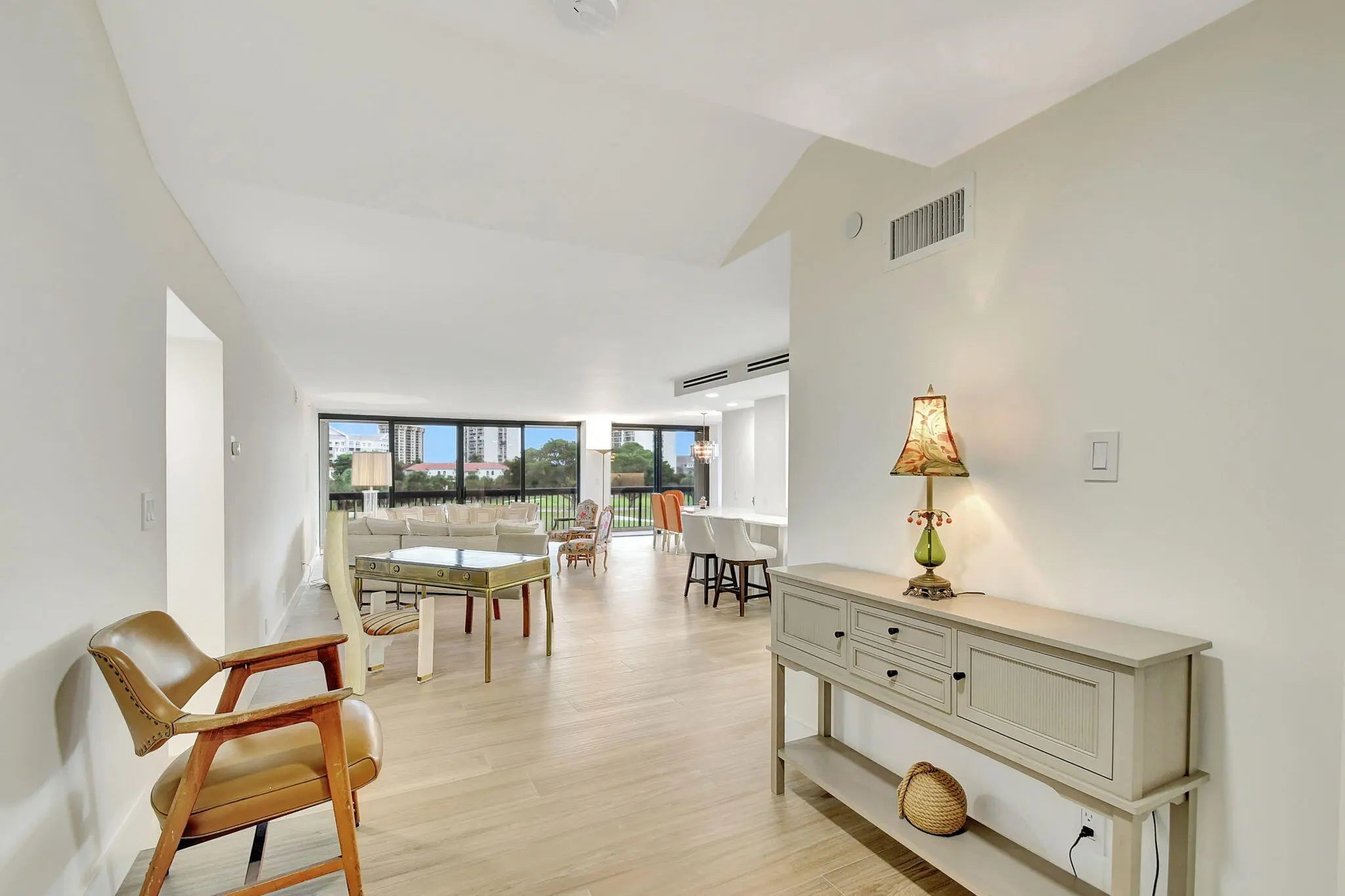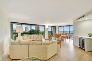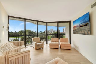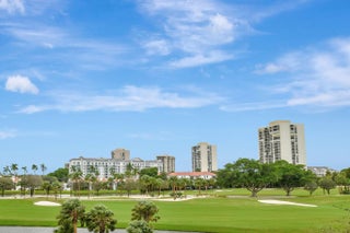 BEAUTIFUL NEW RENOVATION ~ TURNKEY! Fully renovated by an architect down to the studs, every inch of this unit is new: drywall, plumbing, electricity, AC, water heater, porcelain tile flooring, and a stylish open-concept kitchen and living area. The master bath offers a unique touch with a fogged privacy window--clear with the press of a button for a seamless blend of privacy and openness. Floor-to-ceiling windows frame stunning views of the lake, golf course, and breathtaking sunsets, while the expansive 850 SF wrap-around balcony offers a perfect outdoor retreat. Great amenities: Pool, Spa, Tennis, Pickleball, Gym, Sauna, Updated Lobby, Community Room, 1 Covered Parking #28, plus AMPLE parking, open and guest. 10 minutes from PBI Airport.