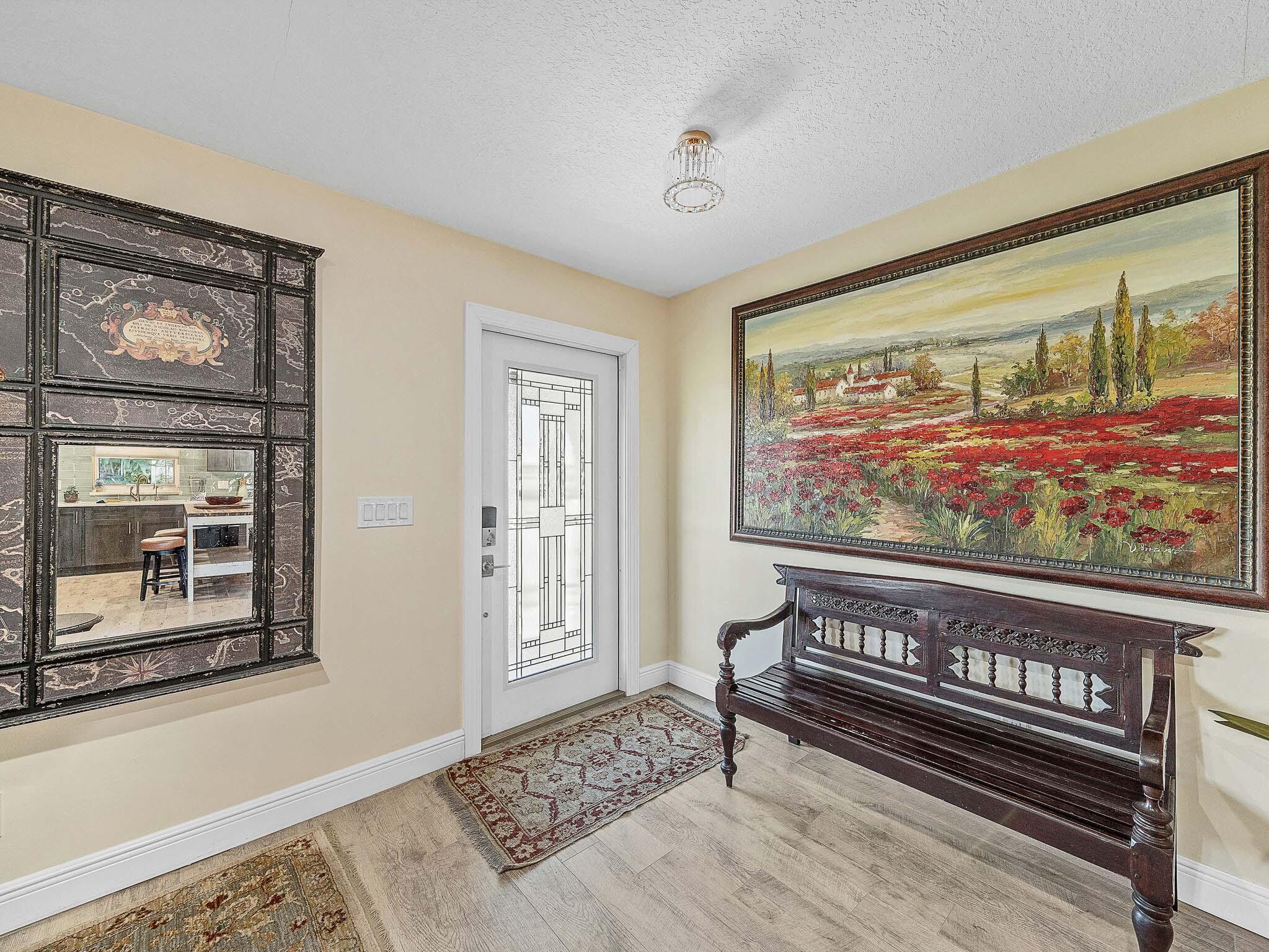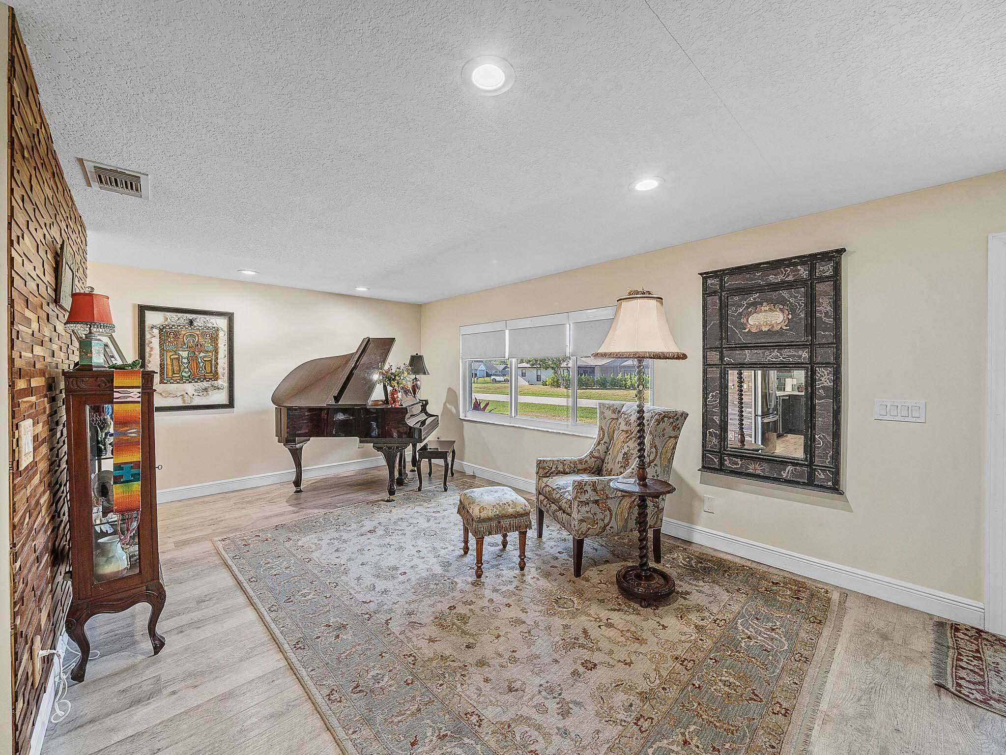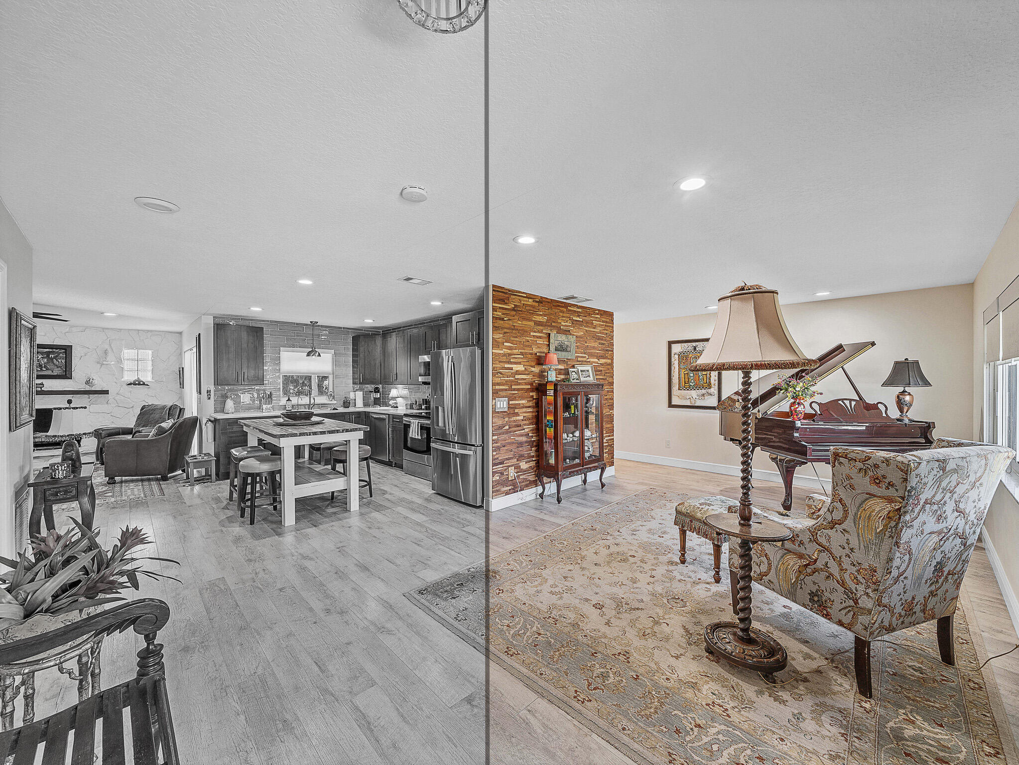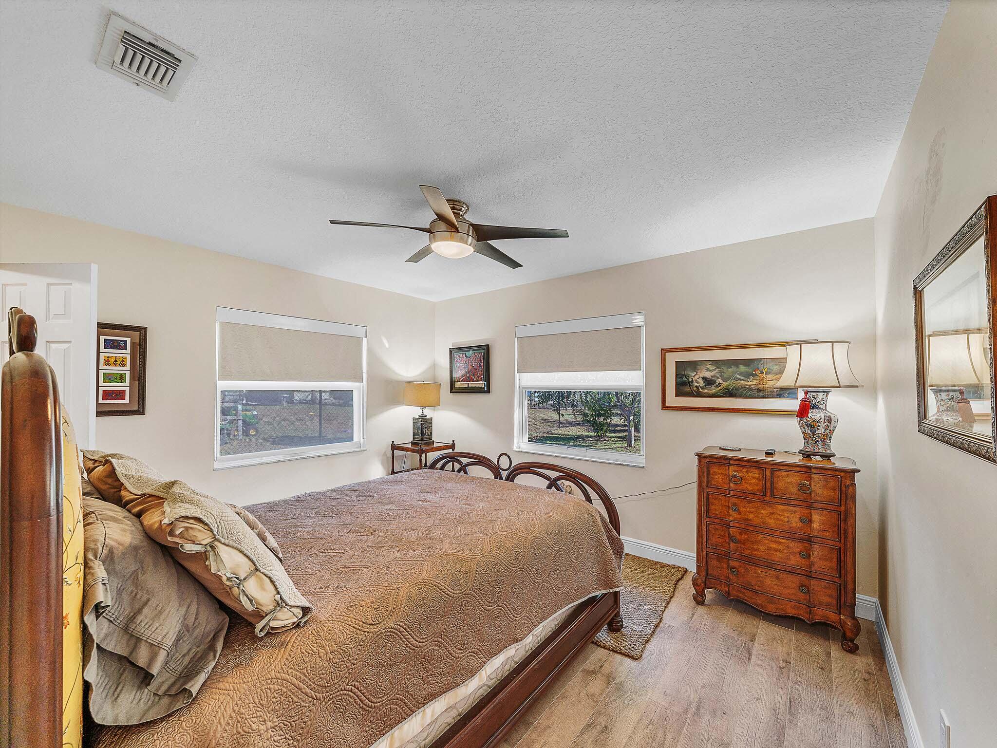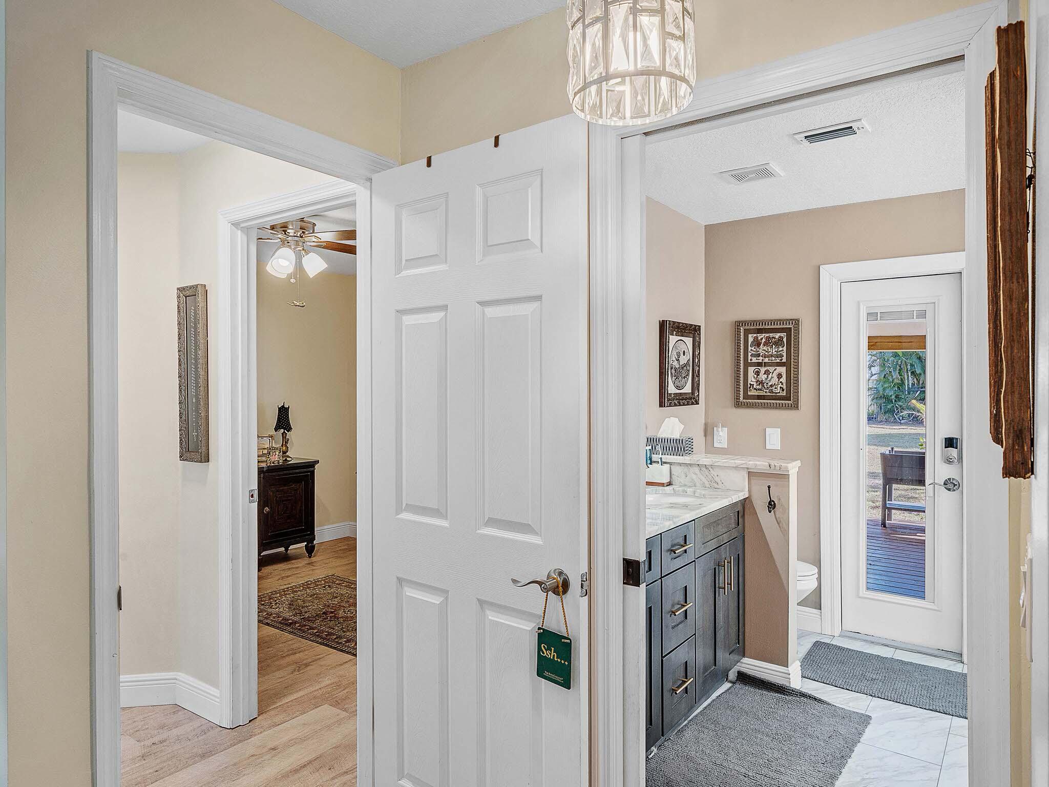 Tucked away in the heart of Sandpiper Bay, this one-of-a-kind 3 bed 2-bath 2-car CBS 1532 sqft. home sits on an impressive .31-acre lot, an exceptionally rare find offering a blend of space, privacy, character with modern upgrades & improvements that create a true private sanctuary. All the expensive improvements already done, saving you money & time: new metal roof (June 2025), 50-gallon hot water heater (2025), freshly painted interior (Dec 2025) impact windows (2024), whole-house water softener system (2024), new doors (2023), large side brick Paver driveway equipped with a 30-amp RV hookup (2024) A/C (2018), garage door (2018), and stainless steel appliances replaced within the last two years. Inside, an open floor plan with light beach-washed laminate wood-style flooring, white-washed stone wall (real wood-burning) fireplace, a striking mosaic wood accent wall, and custom-made double window treatments throughout! The exceptionally large primary bedroom/bath features a cabana door directly from the bathroom to the outdoor deck and has a massive walk-in shower, seamlessly blending indoor and outdoor living. The gem of this home; the large lavish ultra-private backyard oasis. Fully chain-link fenced is both bougie and serene, surrounded by mature tropical & exotic trees that include rainbow eucalyptus, strawberry tree, Persian lime, mango, Magnolia and palms, offering beauty, shade, and a resort-like atmosphere. A wooden deck spanning nearly the entire length of the home invites effortless entertainment, morning coffee rituals watching the sunrise, while the outdoor shower enhances the laid-back Florida lifestyle. Every detail feels intentional, timeless, Classic Florida charm, yet relaxed. This is that rare house for sale that simply doesn't exist elsewhere on the market. Located 1 mile from the expanding Port District, an area seeing major city investment including new riverfront parks, boardwalks, and recreation along the St. Lucie River. This growing destination adds long-term value and lifestyle appeal, all while offering no HOA monthly fees. A smart choice for buyers looking to purchase in an area positioned for continued growth.