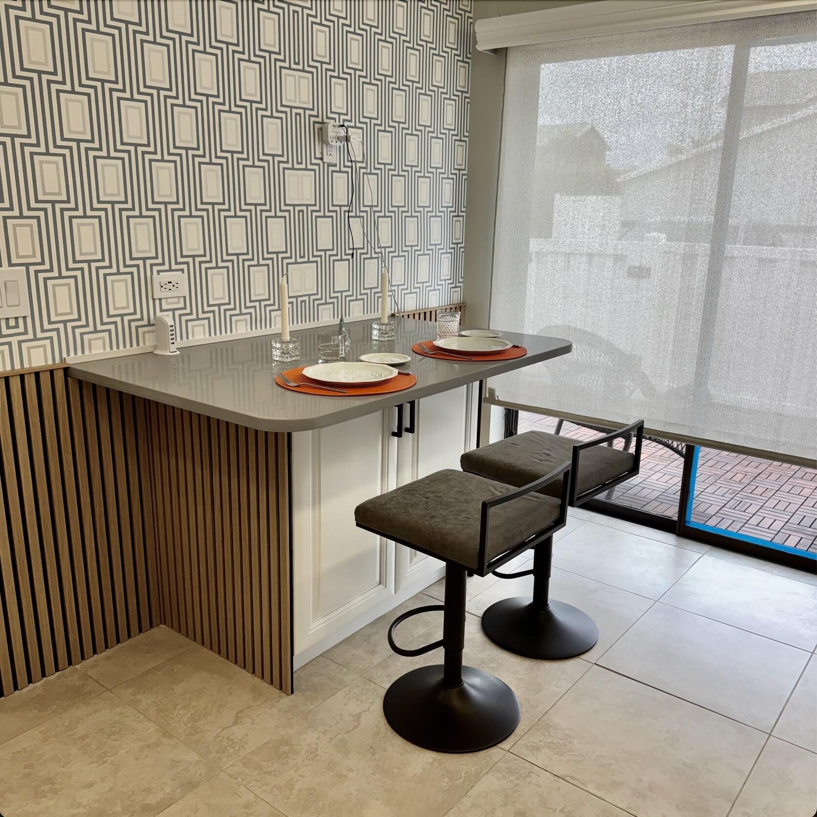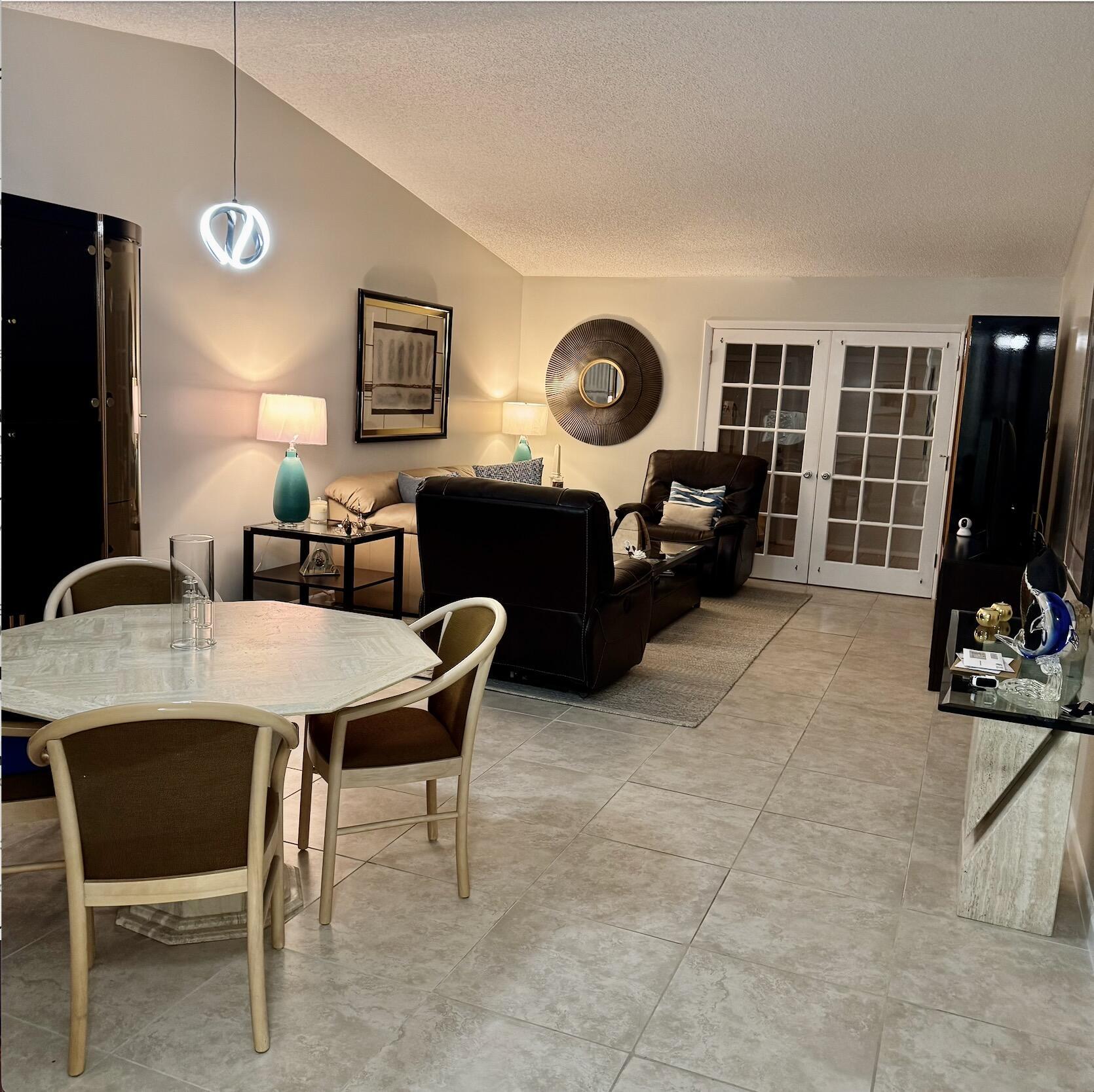 Step into comfort and style in this beautifully remodeled 2-bedroom, 2-bath villa located in the pet-friendly 55+ Arbours of the Palm Beaches (residents 18+ welcome). The home offers an open, airy layout with vaulted ceilings and tile and wood flooring throughout. Enjoy peaceful mornings in the private, fenced front courtyard with new acacia teak wood tile, and unwind in the enclosed porch for added living space. The bright, updated kitchen features white cabinetry, newer appliances, backsplash, pantry, and a cozy eat-in area. Both bathrooms have been thoughtfully renovated with modern vanities, anti-fog mirrors, bidet-equipped toilets, and whisper-quiet fans, creating a calm, spa-like feel. The primary bath includes a jacuzzi tub, and the guest bath features a shower panel.Additional upgrades include keyless entry, USB and USB-C outlets, Nest thermostat, metal shutters and sensor lighting. Association fees include a newer 2022 roof, exterior maintenance, cable, internet, water, amenities, and more. Centrally located near shopping, dining, PBI Airport, parks, and major highwaysthis home offers easy, carefree Florida living.