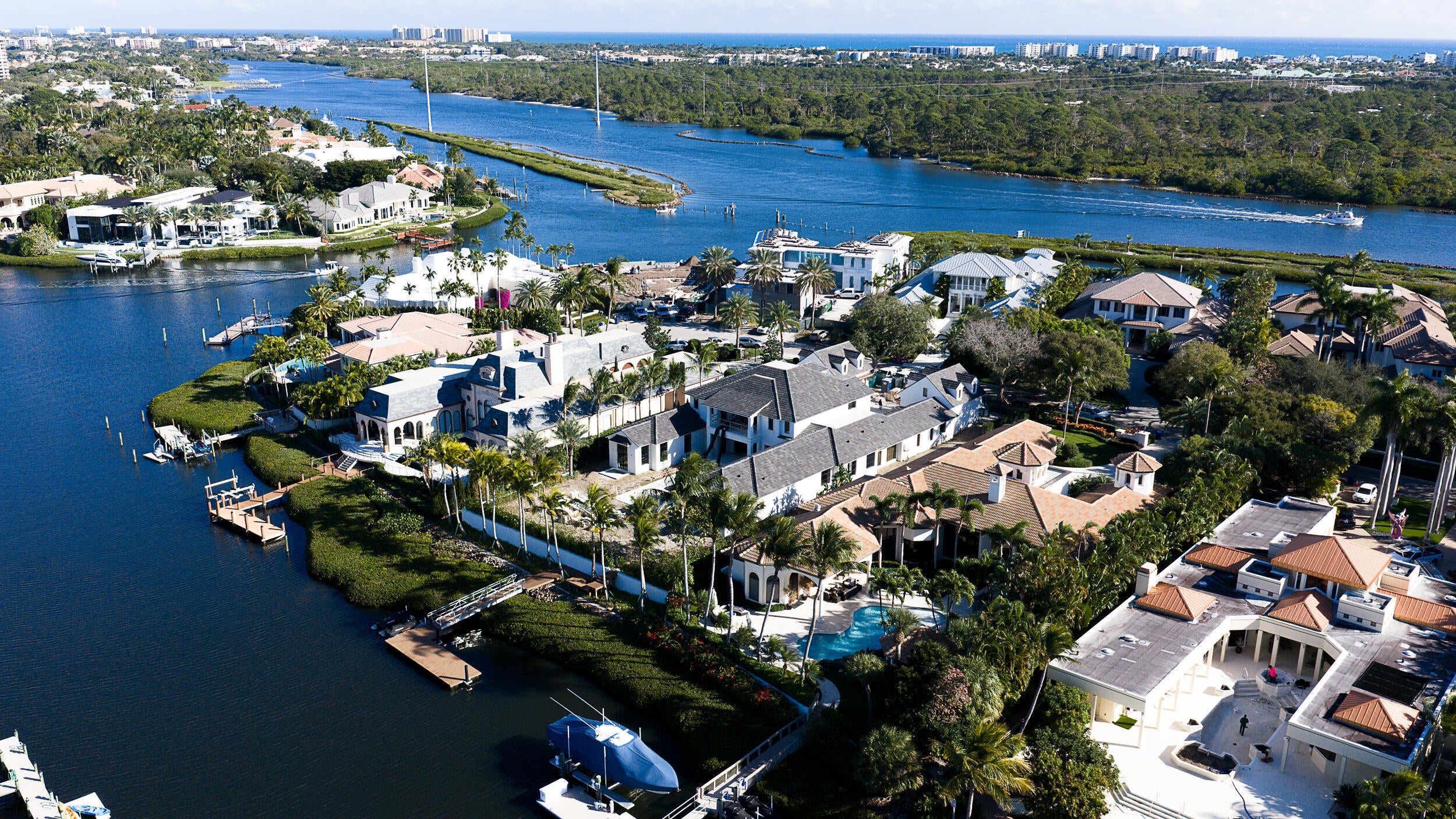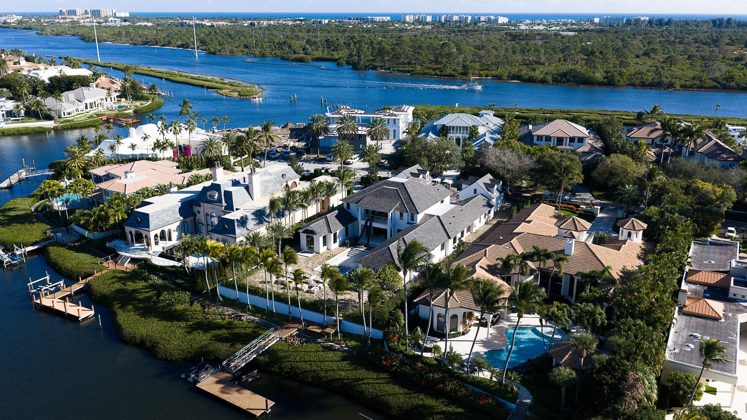 A nearly complete brand-new waterfront estate home, on one of the most exclusive private island streets in all of Admirals Cove. 228 Commodore offers the rare opportunity to acquire a nearly finished custom residence in a premier waterfront location with direct ocean access and just minutes from the intracoastal waterways. The floor plan centers around open-concept living spaces anchored by a dramatic great room with soaring gabled ceilings and stained cypress beams, flowing into a chef's kitchen with large island, walk-in pantry, and seamless indoor-outdoor connectivity through pocket sliding glass doors. The primary suite is located on the main level, offering a spa-style bath, dual walk-in closets, and direct access to outdoor living areas.Additional en-suite guest bedrooms, an upstairs theater, and flexible second floor living spaces provide versatility for full-time or seasonal use. Architectural and construction details include Ludowici clay tile roofing, smooth stucco exterior, LaFinestra impact-rated metal windows and doors, cast stone accents, copper gutters, and stained wood ceilings throughout the covered loggias. Outdoor living is designed for year-round enjoyment with a custom pool and spa, summer kitchen, fireplace, and motorized roll-down screens. The residence is designed with the discerning homeowner in mind, including a home generator, reverse osmosis water system for the house and dock, advanced HVAC with air purification, Italian cobblestone driveway, custom cabinetry and so much more. Located within Admirals Cove, residents enjoy access to 45 holes of championship golf, two clubhouses, a private marina, on-site dining, fitness and wellness facilities, and a private hotel, along with manned security and a central Jupiter location near beaches, the inlet, and dining.