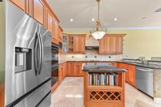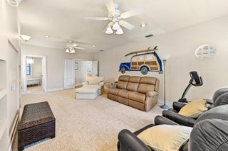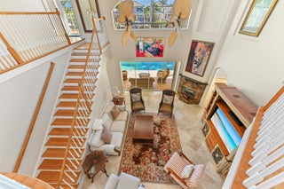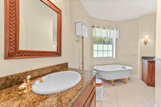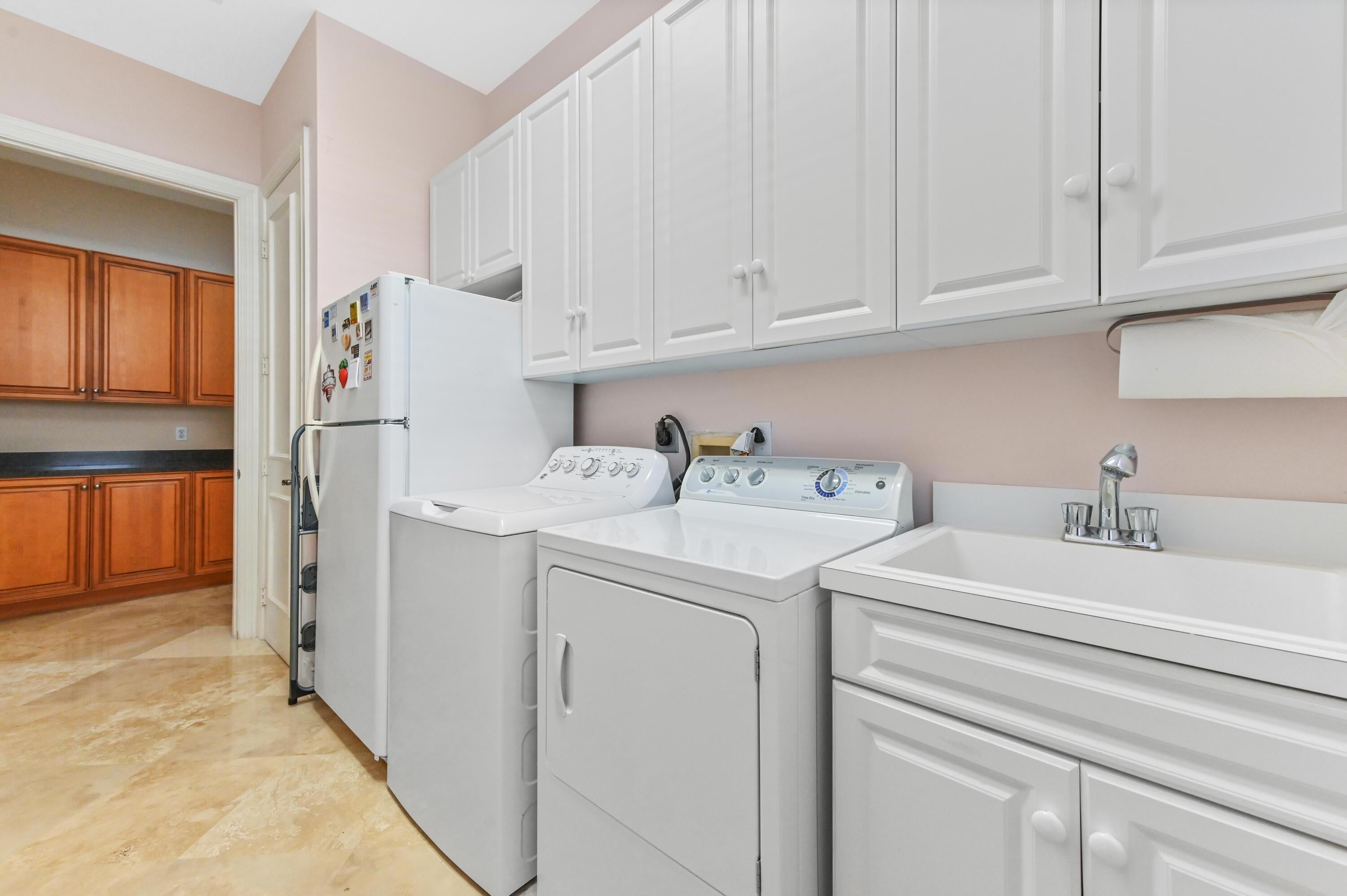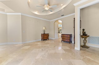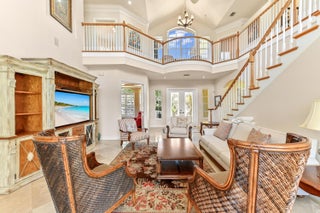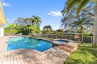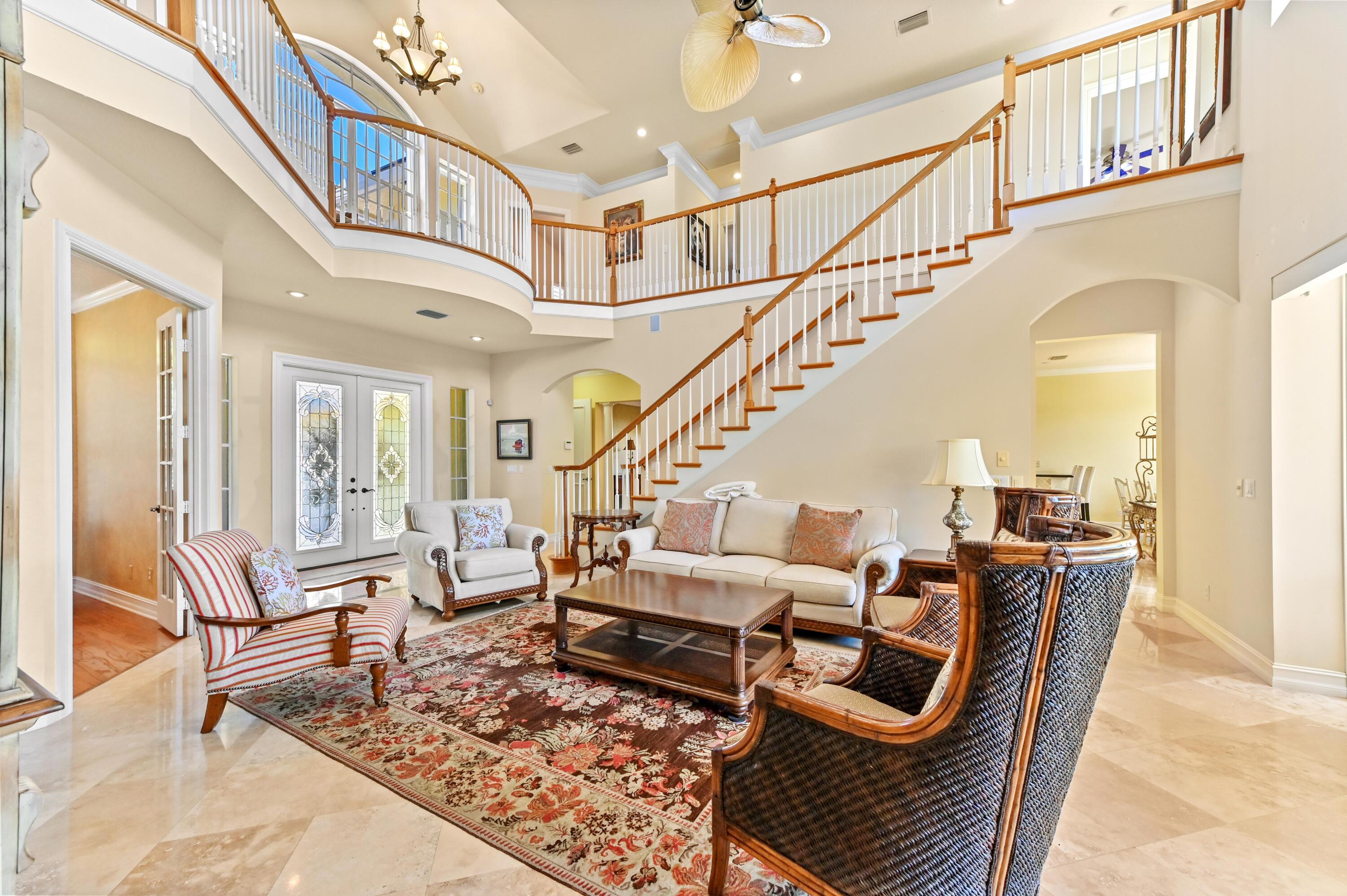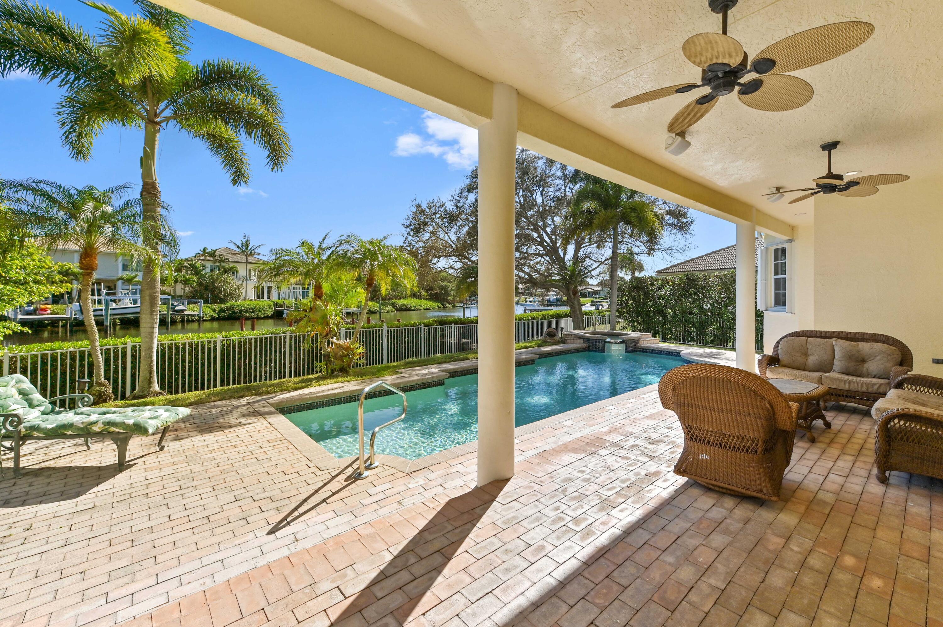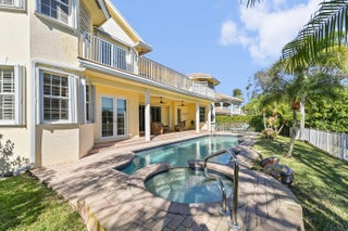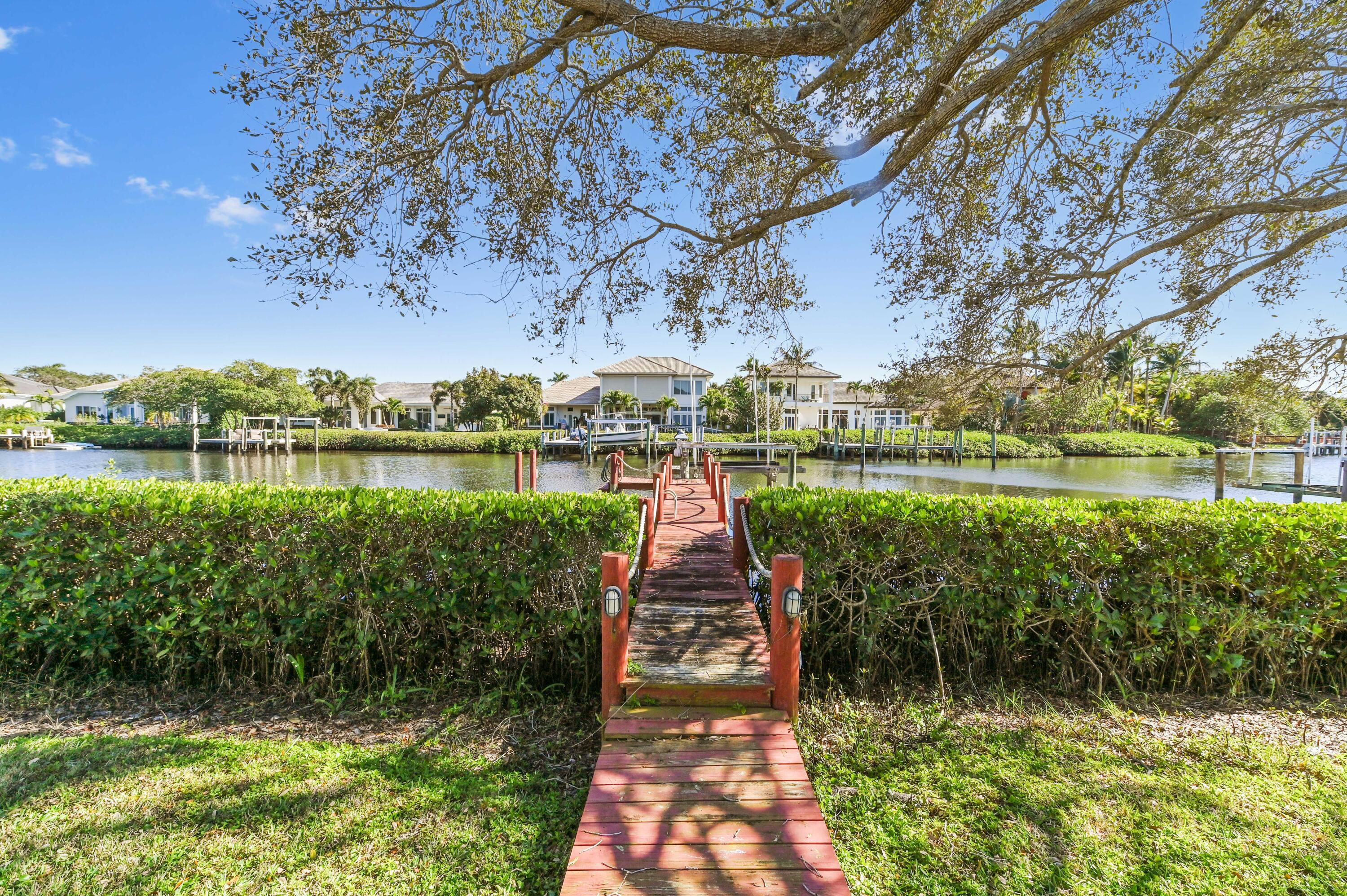 This stunning waterfront home features 6 beds 4 full baths plus an office as well as an additional upstairs flex space offers exceptional curb appeal and thoughtful design throughout, set on a 0.275-acre lot with 4,285 sq ft of living space. Built on a 2-ft stem wall for added elevation.Inside, the spacious great room features soaring 22' crowned ceilings and tranquil views of the Loxahatchee River. Saturnia marble floors flow throughout the first-floor living areas, with hardwood flooring in the den/office. A large, separate formal dining room showcases double coffered ceilings and elegant columns.The gourmet kitchen is ideal for entertaining, featuring granite countertops, tumbled marble backsplash, 42" raised-panel cabinets, double ovens, crown molding, and updated appliances, including a 2024 refrigerator with a 5-year warranty and a 2024 dishwasher with a 3-year warranty. Oversized sliding pocket doors open seamlessly to the pool and outdoor living area. The primary suite is located on the first floor, offering a luxurious bath with Crema Marfil marble floors, dual showers, granite vanities, a walk-in closet, a Roman tub, and classic column details. A wide southern-style oak staircase leads upstairs to a hardwood catwalk and circular "captain's perch" interior balcony, highlighted by over 65 feet of oak railings and spindles. The second level features 4 bedrooms plus a large game room/flex space (which may serve as a 7th bedroom or maid in law). One bedroom is uniquely octagon-shaped and connects to an antique-style bathroom with a clawfoot tub and European "growler" water closet. This entire wing, bedroom, bath, and game room can function as a separate living area for guests or relatives. Enjoy beautiful sunrises from the 42' second-floor balcony overlooking the river and pool area. Outdoor highlights include a heated pool and spa, a dock with a boat lift, a metal-fenced backyard, Cat 5 shutters, retractable blinds, replaced garage doors, and an oversized paver driveway with a 3-car attached garage and extra parking space. Additional features include a 3-zone A/C system, a built-in high-fidelity sound system on the first floor, and a 2022 washer with a 5-year warranty. Ideally located just 15 minutes from the inlet, this home offers the perfect blend of luxury, privacy, and waterfront living.
