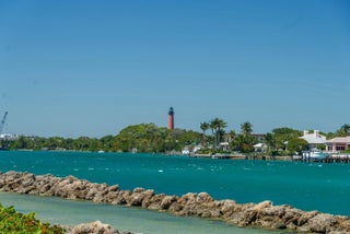 To mark the reef lying off the Jupiter Inlet, Congress in 1853 appropriated $35,000 to construct a lighthouse. At the top of the Jupiter Lighthouse, you can see the Loxahatchee River.